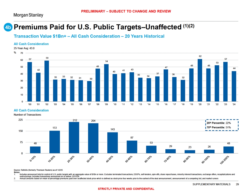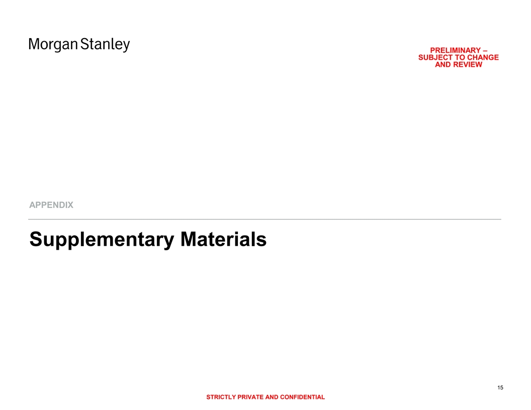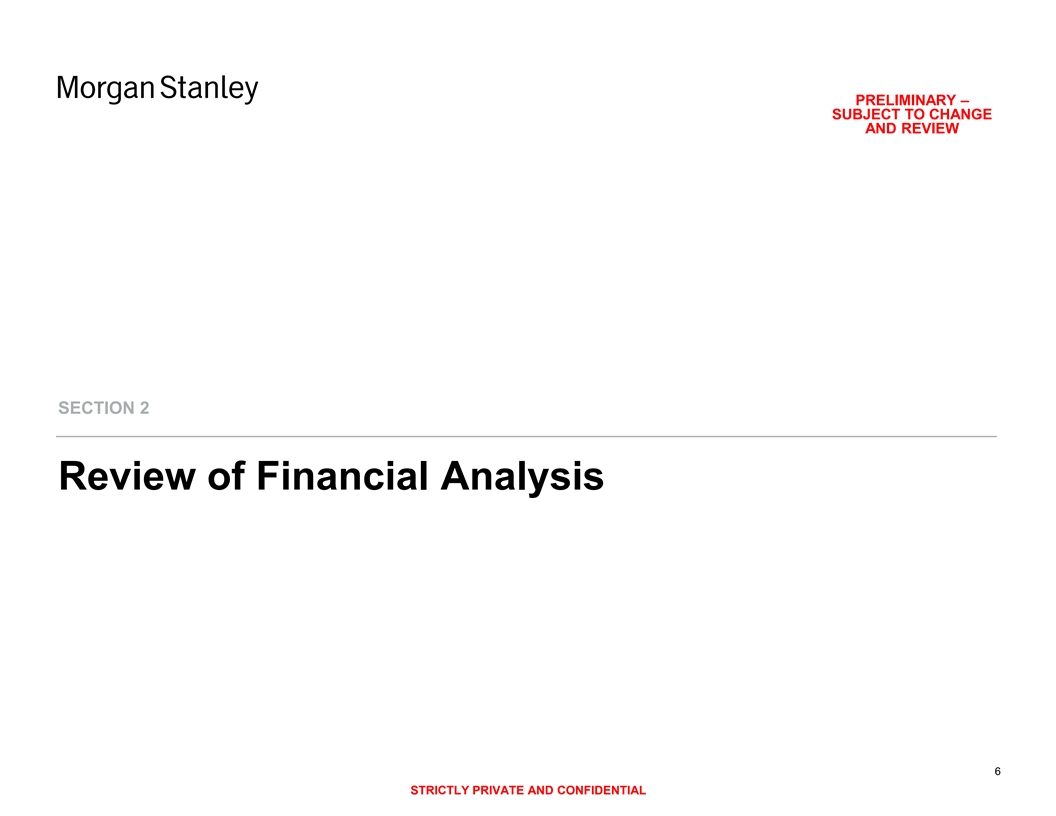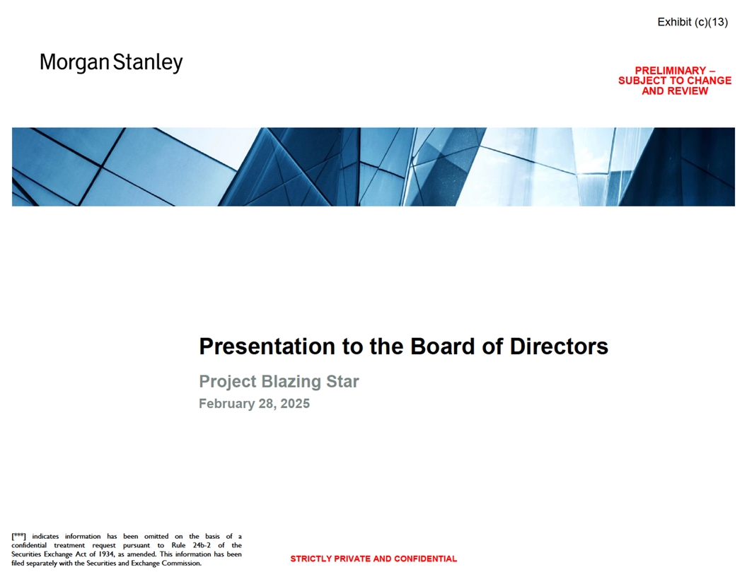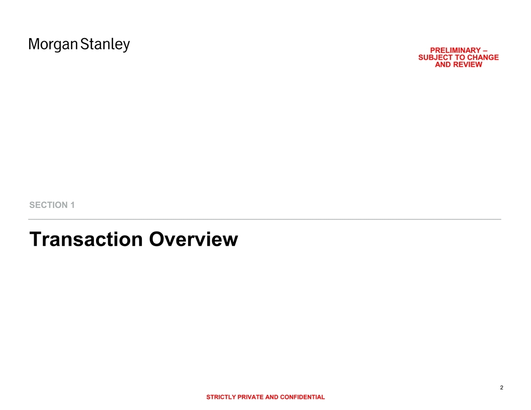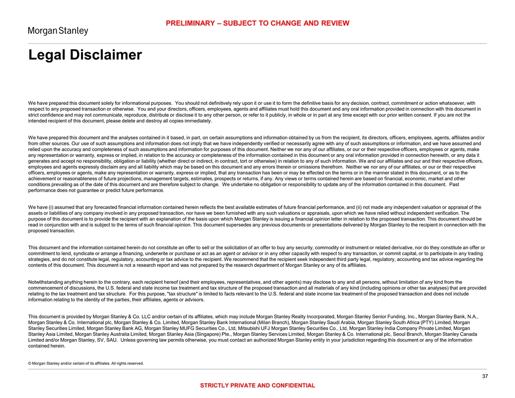 初步–可能会更改和审查法律免责声明我们编写本文件仅供参考。您不应明确依赖它或使用它来构成任何决定、合同、承诺或行动的最终基础,就任何拟议交易或其他方面而言。您和您的董事、高级职员、雇员、代理人和关联公司必须严格保密地持有本文件以及就本文件提供的任何口头信息,除非我们事先书面同意,否则不得在任何时候向任何其他人传达、复制、分发或披露,或公开、全部或部分引用。如果您不是本文件的预定收件人,请立即删除并销毁所有副本。我们编制这份文件以及其中所包含的分析,部分是基于我们从收件人、其董事、高级职员、雇员、代理人、关联公司和/或其他来源获得的某些假设和信息。我们使用此类假设和信息并不意味着我们已独立验证或必然同意任何此类假设或信息,并且我们已为本文件的目的假设并依赖此类假设和信息的准确性和完整性。我们或我们的任何关联公司,或我们或他们各自的高级职员、雇员或代理人,均不对本文件所载信息或与此相关的任何口头信息的准确性或完整性作出任何明示或暗示的陈述或保证,或其生成的任何数据,并且不接受与任何此类信息有关的任何责任、义务或责任(无论是直接或间接、合同、侵权或其他方面)。我们和我们的关联公司以及我们和他们各自的高级职员、雇员和代理人明确表示不承担可能基于本文件及其任何错误或遗漏的任何和所有责任。我们或我们的任何关联公司,或我们或他们各自的高级职员、雇员或代理人,均不对任何交易已经或可能按照本文件所述的条款或方式进行,或对未来预测、管理目标、估计、前景或回报(如有)的实现或合理性作出任何明示或暗示的陈述或保证。此处包含的任何观点或条款均基于截至本文件发布之日的财务、经济、市场和其他条件,因此可能会发生变化。我们不承担更新本文件中包含的任何信息的义务或责任。过往业绩不保证或预测未来业绩。我们(i)假设此处包含的任何预测财务信息反映了对未来财务业绩的最佳可用估计,并且(ii)没有对任何拟议交易中涉及的任何公司的资产或负债进行任何独立估值或评估,也没有向我们提供任何此类估值或评估,我们在未经独立核实的情况下所依赖的估值或评估。本文件的目的是向收件人解释摩根士丹利就拟议交易出具财务意见函所依据的基础。本文件应与该财务意见的条款一并阅读,并以该财务意见的条款为准。本文件取代摩根士丹利先前就拟议交易向接收方交付的任何文件或演示文稿。本文件和此处包含的信息不构成出售要约或购买任何证券、商品或工具或相关衍生工具的要约邀请,也不构成出借、银团或安排融资、承销或购买或就任何交易担任代理或顾问或以任何其他身份,或承诺资本,或参与任何交易策略的要约或承诺,也不构成对接收方的法律、监管、会计或税务建议。我们建议收件人就本文件的内容寻求独立的第三方法律、监管、会计和税务建议。本文件不是研究报告,也不是由摩根士丹利研究部或其任何关联机构编制。尽管本文中有任何相反的规定,本文的每个接收者(及其雇员、代表和其他代理人)可以从讨论开始时不受任何种类限制地向任何和所有人披露拟议交易的美国联邦和州所得税待遇和税收结构,以及提供的与税收待遇和税收结构有关的任何种类的所有材料(包括意见或其他税收分析)。为此, 税收结构仅限于与拟议交易的美国联邦和州所得税处理相关的事实,不包括与各方、其关联公司、代理人或顾问的身份相关的信息。本文件由摩根士丹利 & Co. LLC和/或其某些关联公司提供,其中可能包括摩根士丹利 Realty Incorporated、摩根士丹利 Senior Funding,Inc.、摩根士丹利 Bank,N.A.、摩根士丹利 & Co. International plc、摩根士丹利 & Co. Limited、摩根士丹利 Bank International(Milan Branch)、摩根士丹利TERMSaudi Arabia、摩根士丹利TERMSouth Africa(PTY)Limited、摩根士丹利 Securities Limited、摩根士丹利 Bank AG、摩根士丹利MUFGTERM13 Securities Co.,Ltd.,Mitsubishi UFJ 摩根士丹利 Securities Co.,Ltd.,TERM14 Securities Co.,Ltd.,TERM10 Securities Limited,TERM11 Bank AG,TERM12TERM12TERM13TERM13 Securities Co.,Ltd.,Mitsubishi UFJ TERM14 Securities Co.,Ltd.,TERM10 Securities Co摩根士丹利服务有限公司、摩根士丹利 & Co. International plc、Seoul Branch、摩根士丹利 Canada Limited和/或摩根士丹利,SV,SAU。除非管辖法律另有许可,否则您必须就本文件或此处包含的任何信息与您所在司法管辖区的授权摩根士丹利实体联系。©摩根士丹利和/或其某些关联公司。版权所有。37严格保密