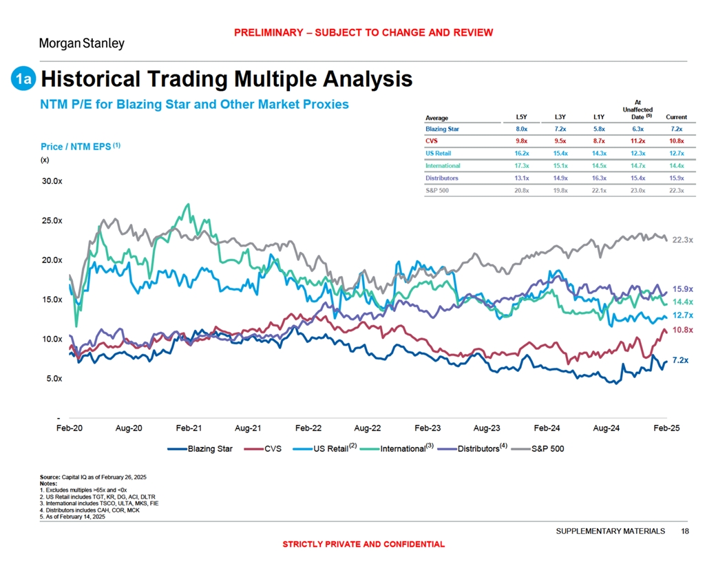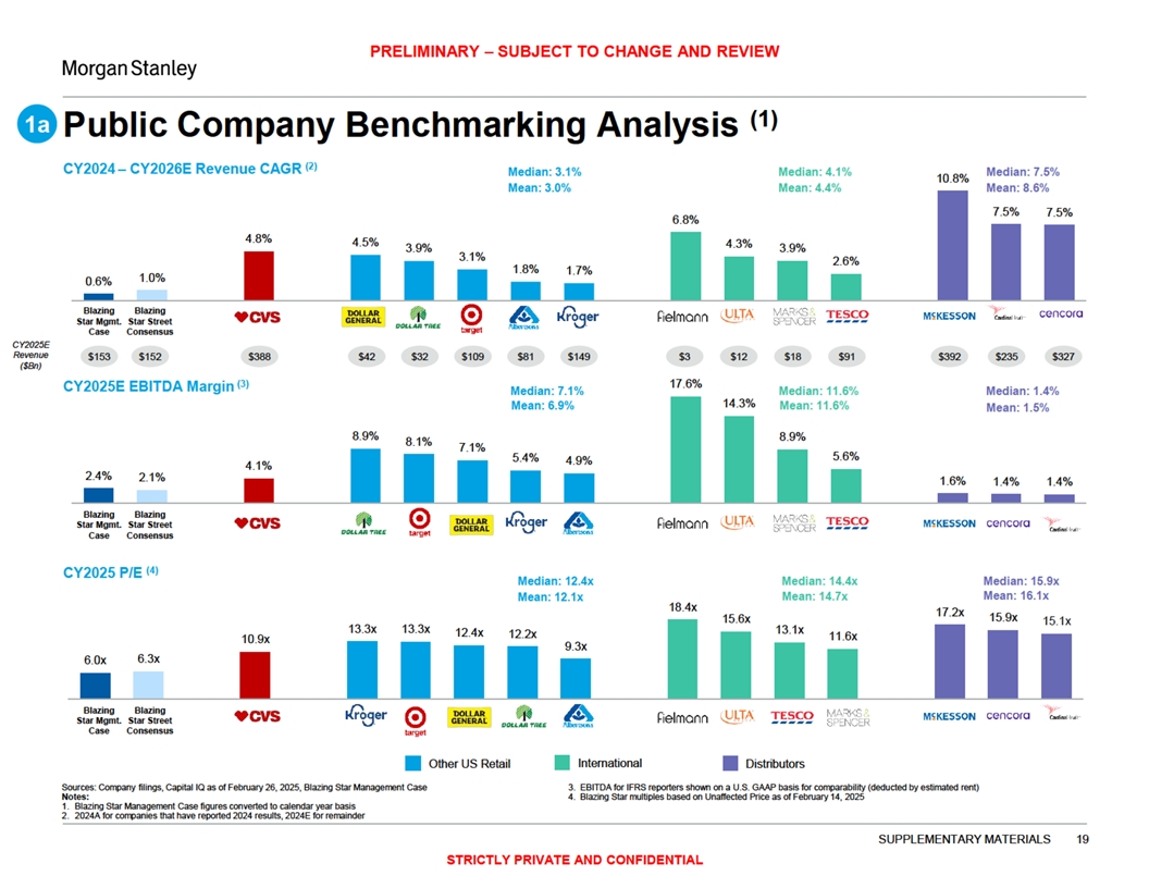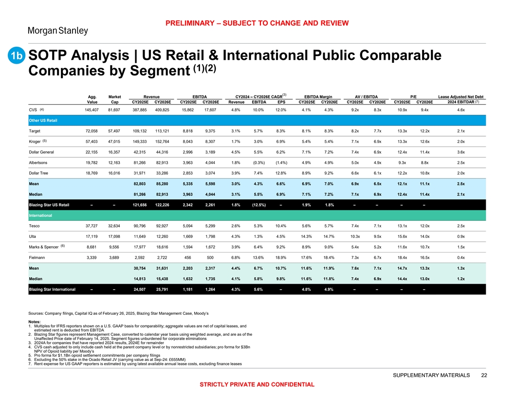 初步–待更改及检讨1b SOTP分析|美国零售及国际公共可比(1)(2)按分部划分的公司(3)Agg。Market Revenue EBITDA CY2024 – CY2026E CAGR EBITDA Margin AV/EBITDA P/E Lease Adjusted Net Debt(7)Value Cap CY2025E CY2026E CY2025E CY2025E Revenue EBITDA EPS CY2025E CY2026E CY2025E CY2026E CY2025E CY2026E CY2026E EBITDA EPS EPS EPS EPS EPS EPS EPS EPS EPS EPS EPS EPS EPS EPS EPS EPS EPS EPS EPS EPS EPS EPS EPS EPS EPS EPS EPS EPS EPS EPS EPS EPS EPS EPS EPS EPS EPS EPS EPS EPS EPS EPS EPS EPS EPS EPS EPS EPS EPS EPS EPS EPS EPS EPS EPS EPS EPS EPS EPS EPS EPS EPS EPS EPS EPS EPS EPS EPS EPS EPS EPS EPS EPS EPS EPS EPS EPS EPS EPS EPS EPS EPS EPS EPS EPS EPS EPS EPS EPS EPS EPS EPS4.5% 5.5% 6.2% 7.1% 7.2% 7.4x 6.9x 12.4x 11.4x 3.6x艾伯森19,78212,16381,26682,9133,9634,0441.8%(0.3%)(1.4%)4.9% 4.9% 5.0x 4.9x 9.3x 8.8x 2.5x 美元树 18,76916,01631,97133,2862,8533,0743.9% 7.4% 12.8% 8.9% 9.2% 6.6x 6.1x 12.2x 10.8x 2.0x均值82,80385,2805,3355,5983.0% 4.3% 6.6% 6.9% 7.0% 6.9x 6.5x 12.1x 11.1x 2.5x中值81,26682,9133,9634,0443.1% 5.5% 6.9% 7.1% 7.2% 7.1x 6.9x 12.4x 11.4x 2.1x Bla192,9275,0945,2992.6% 5.3% 10.4% 5.6% 5.7% 7.4x 7.1x 13.1x 12.0x 2.5x Ulta 17,11917,09811,64912,2601,6691,7984.3% 1.3% 4.5% 14.3% 14.7% 10.3x 9.5x 15.6x 14.0x 0.9x(6)Marks & Spencer 8,6819,55617,97718,6161,5941,6723.9% 6.4% 9.2% 8.9% 9.0% 5.4x 5.2x 11.6x 10.7x 1.5x Fielmann 3,3393,6892,5922,7224565006.8% 13.6% 18.9% 17.6% 18.4% 7.3x 6.7x 18.4x 16.5x 0.4x均值30,75431,6312,2032,3174.4% 6.7% 10.7% 11.6% 11.9% 7.6x 7.1x 14.1国际–– 24,50725,7911,1811,2644.3% 5.6% – 4.8% 4.9% –– ––资料来源:公司备案,Capital IQ截至2025年2月26日,Blazing Star Management案例,穆迪说明:1。国际财务报告准则报告人的倍数显示在美国公认会计原则的基础上,用于可比性;总值是扣除资本租赁的净额,估计租金是从EBITDA 2中扣除的。Blazing Star数字代表管理案例,使用加权平均转换为日历年度基础,截至2025年2月14日的未受影响价格日期。部门数字为企业消除负担3。2024A为已报告2024年业绩的公司,2024E为剩余4。调整后的CVS现金仅包括在母公司层面或非受限制子公司持有的现金;根据穆迪5计算的30亿美元阿片类药物负债NPV的备考。每个公司申报的11亿美元阿片类药物和解承诺的备考6。不包括Ocado Retail合资企业的50%股权(截至9月24日的账面价值:655mm英镑)7。美国GAAP记者的租金费用是通过使用最新可用的年度租赁成本估算的,不包括融资租赁补充材料22严格私人和保密