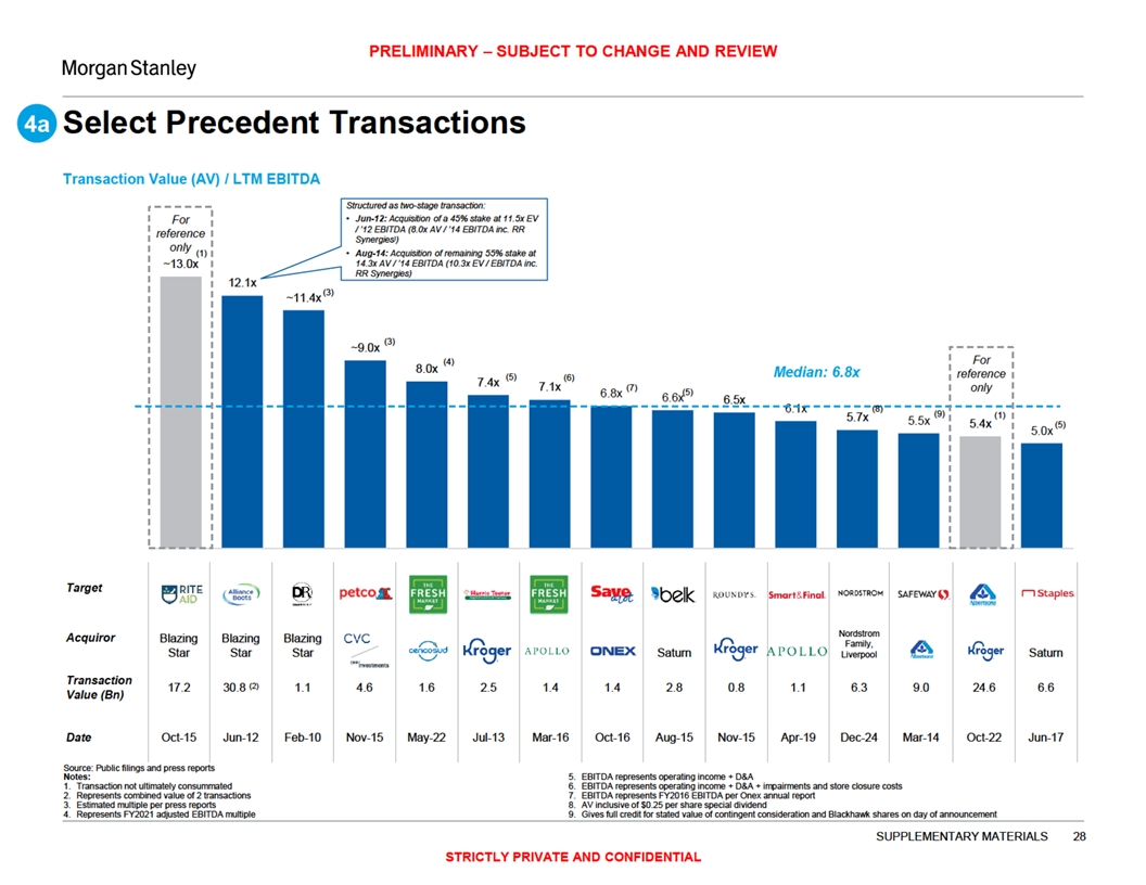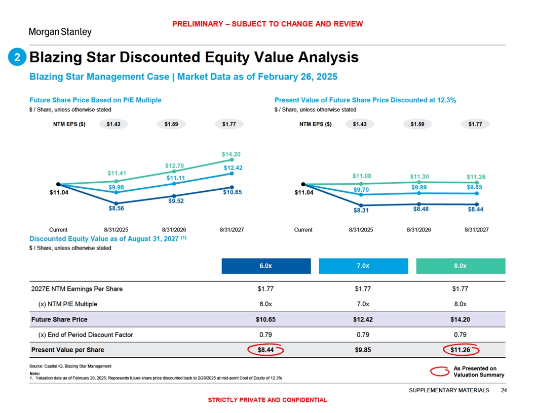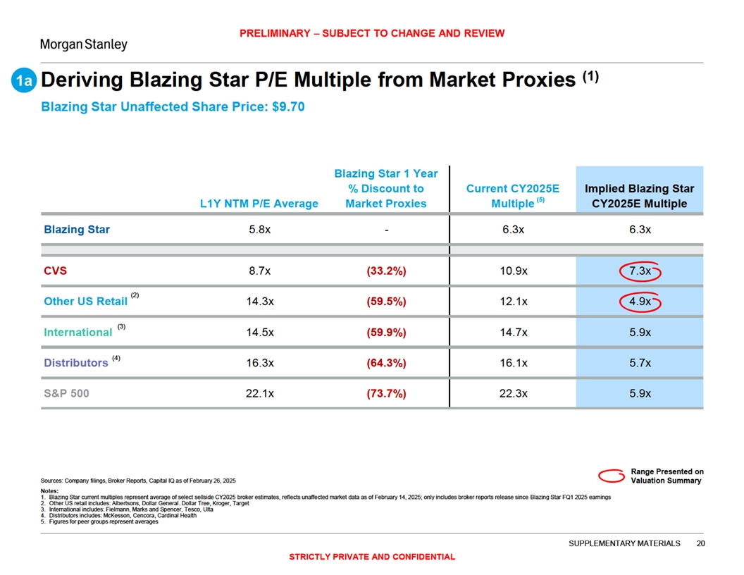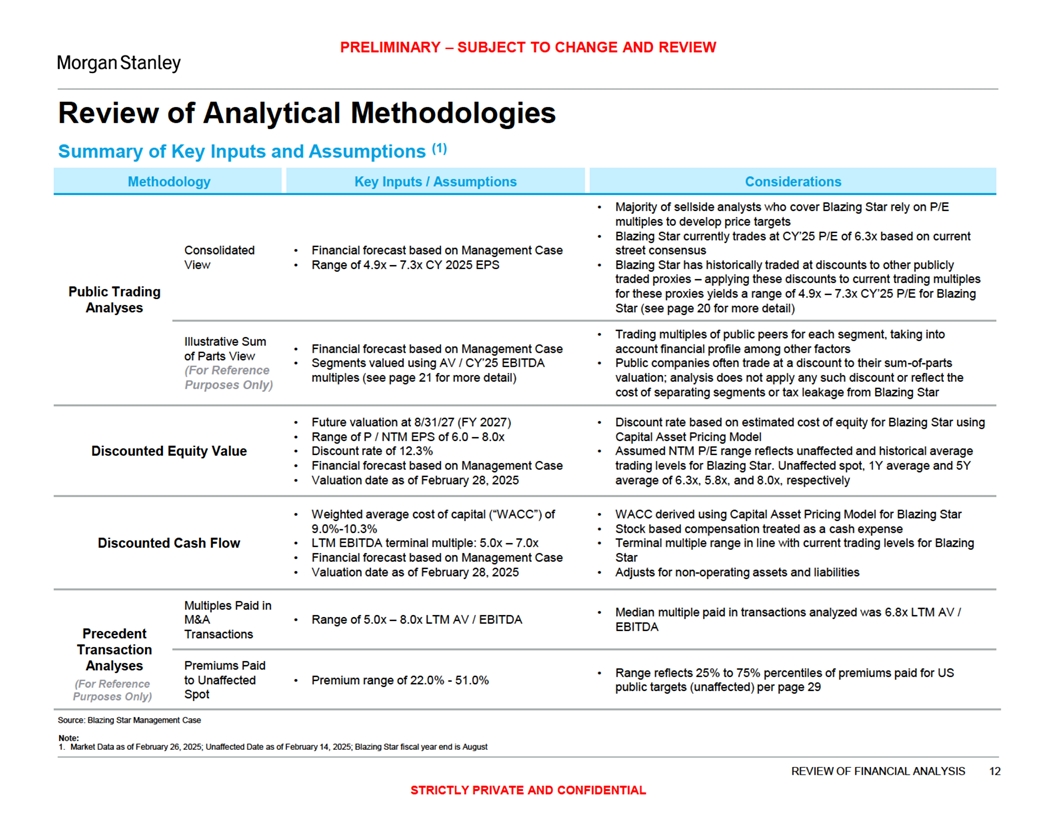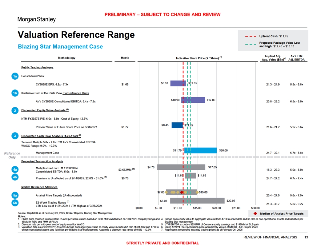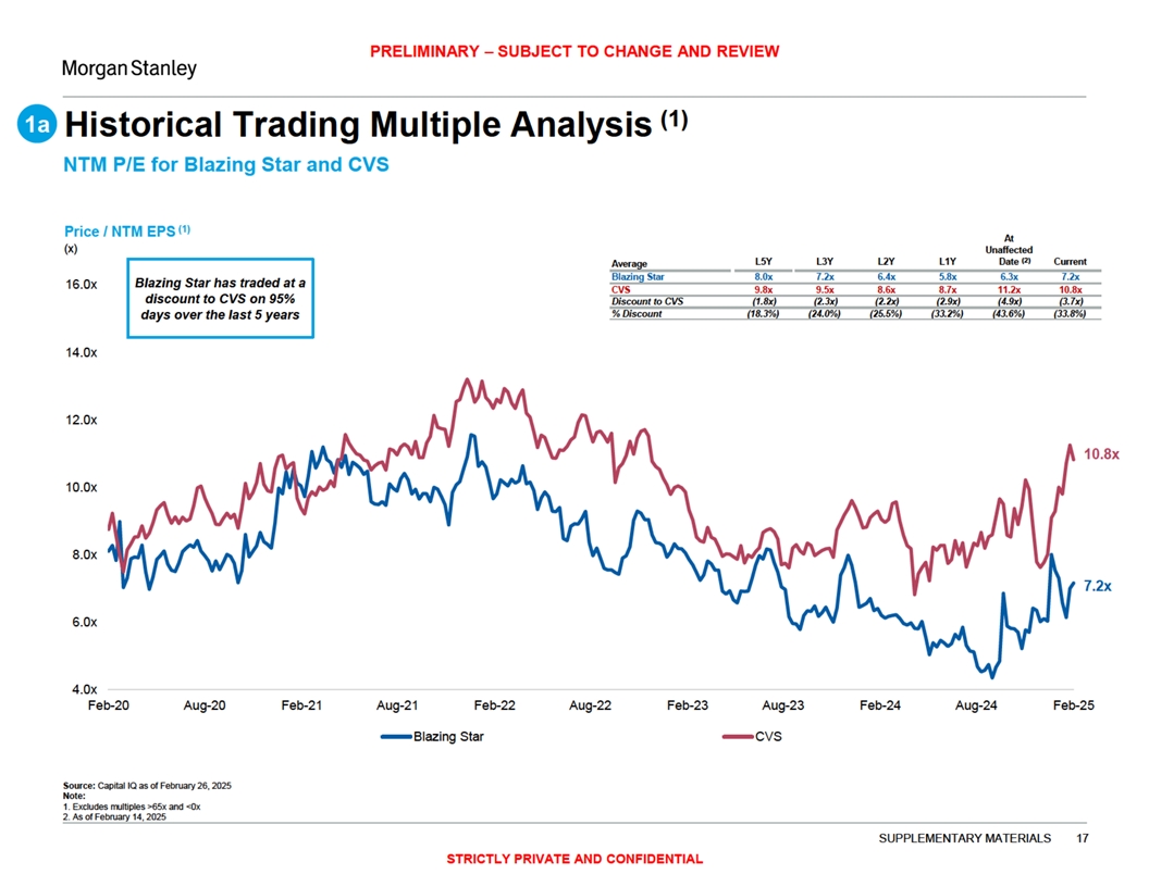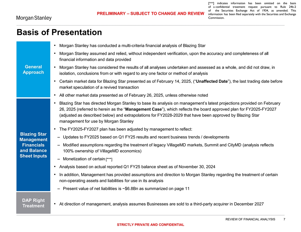 [***]表示根据经修订的1934年《证券交易法》第24b-2条规定的保密处理请求,信息已被遗漏。这份初步–可能更改和审查的信息已分别提交给美国证券交易委员会。列报基础• 摩根士丹利已对Blazing Star进行了多标准财务分析• 摩根士丹利在未经独立核实的情况下假设并依赖于所提供的所有财务信息和数据的准确性和完整性一般• 摩根士丹利已将所进行和评估的所有分析的结果作为一个整体考虑,并且没有孤立地从任何一个因素或分析方法中得出或就其得出结论•截至2025年2月14日(“未受影响日期”)呈报的Blazing Star的某些市场数据,市场猜测交易死灰复燃前的最后交易日期•截至2025年2月26日提供的所有其他市场数据,除非另有说明• Blazing Star已指示摩根士丹利根据管理层于2025年2月26日提供的最新预测(此处简称“管理层案例”)进行分析,其中反映了董事会批准的2025-FY2027财年计划(如下所述调整)以及已获Blazing Star管理层批准供摩根士丹利使用的2028-2029财年推断•管理层已对2025-FY2027财年计划进行调整,以反映:Blazing Star –根据25财年第一季度业绩和最近的业务趋势/发展对2025财年进行更新管理层–修改了有关处理遗留VillageMD市场的假设,Summit and CityMD(analysis reflects financials and balance 100% ownership of villageMD economics)Sheet inputs – monetization of certain [***】•基于截至2024年11月30日的实际报告的25财年第一季度资产负债表进行的分析•此外,管理层已就某些非经营性资产和负债的处理向摩根士丹利提供了假设和方向,以供其分析时使用——净负债的现值约为68亿美元,详见第11页DAP Right • at direction of management,分析假设业务于2027年12月出售给第三方收购方财务分析的待遇审查7严格保密