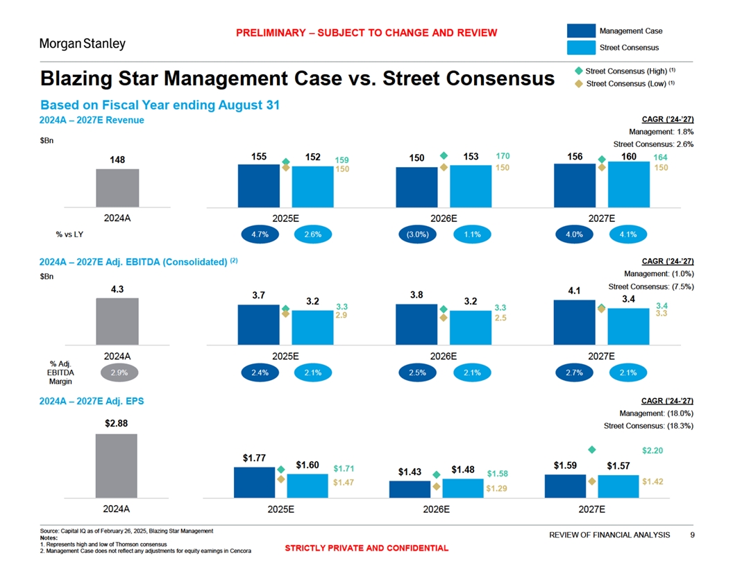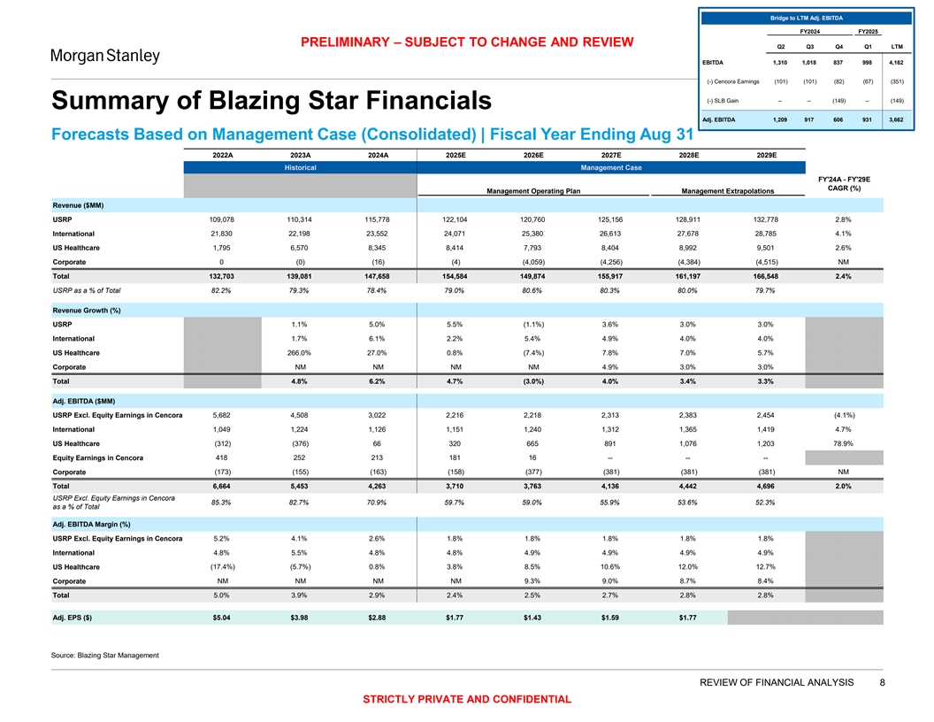 Bridge to LTM Adj. EBITDA FY2024 FY2025 Preliminary – subject to change and review Q2 Q3 Q4 Q1 LTM EBITDA 1,3101,0188379984,162(-)Cencora Earnings(101)(101)(82)(67)(351)(-)SLB收益---(149)-(149)Blazing Star Financials Adj. EBITDA 1,2099176069313,662 Forecasts based on Management Case(Consolidated)| Fiscal Year ending Aug 31 2022A 2023A 2024A 2025E 2026E 2027E 2028E 2029E Historical Management Case FY‘24A-FY’29E CAGR(%)Management Operating Plan22,19823,55224,07125,38026,61327,67828,7854.1%美国医疗保健1,7956,5708,3458,4147,7938,4048,9929,5012.6%企业0(0)(16)(4)(4)(4,059)(4,256)(4,384)(4,515)NM合计132,703139,081147,658154,584149,874155,917161,197166,5482.4% USRP占总额的百分比82.2% 79.3% 78.4% 79.0% 80.6% 80.3% 80.0% 79.7%收入增长(%)USRP 1.1% 5.0% 5.5%(1.1%)3.6% 3.0% 3.0%国际1.7% 6.1% 2.2% 5.4% 4.9% 4.0% 4.0%美国医疗保健266.0% 27.0% 0.8%(7.4%)7.8% 7.0% 5.7%公司NM NM 4.9% 3.0%合计4.8% 6.2% 4.7%(3.0%)4.0% 3.4% 3.3% Adj. EBITDA($ MM)USRP Excl。Cencora的股权收益5,6824,5083,0222,2162,2182,3132,3832,454(4.1%)International 1,0491,2241,1261,1511,2401,3121,3651,4194.7% US Healthcare(312)(376)663206658911,0761,20378.9% Cencora的股权收益41825221318116------Corporate(173)(155)(163)(158)(377)(381)(381)(381)NM Total 6,6645,4534,2633,7103,7634,1364,4424,696 2.0% USRP Excl。Cencora的股权收益85.3% 82.7% 70.9% 59.7% 59.0% 55.9% 53.6% 52.3%占总调整后EBITDA利润率(%)USRP Excl。CenCora的股票收益5.2% 4.1% 2.6% 1.8% 1.8% 1.8% 1.8% 1.8%国际4.8% 5.5% 4.8% 4.8% 4.9% 4.9% 4.9% 4.9%美国医疗保健(17.4%)(5.7%)0.8% 3.8% 8.5% 10.6% 12.0% 12.7%公司NM NM NM 9.3% 9.0% 8.7% 8.4%合计5.0% 3.9% 2.9% 2.4% 2.5% 2.7% 2.8% 2.8% Adj. EPS($)$ 5.04 $ 3.98 $ 2.88 $ 1.77 $ 1.43 $ 1.59 $ 1.77资料来源:Blazing Star Management Review of Financial Analysis 8 Strictly Private and Confidential