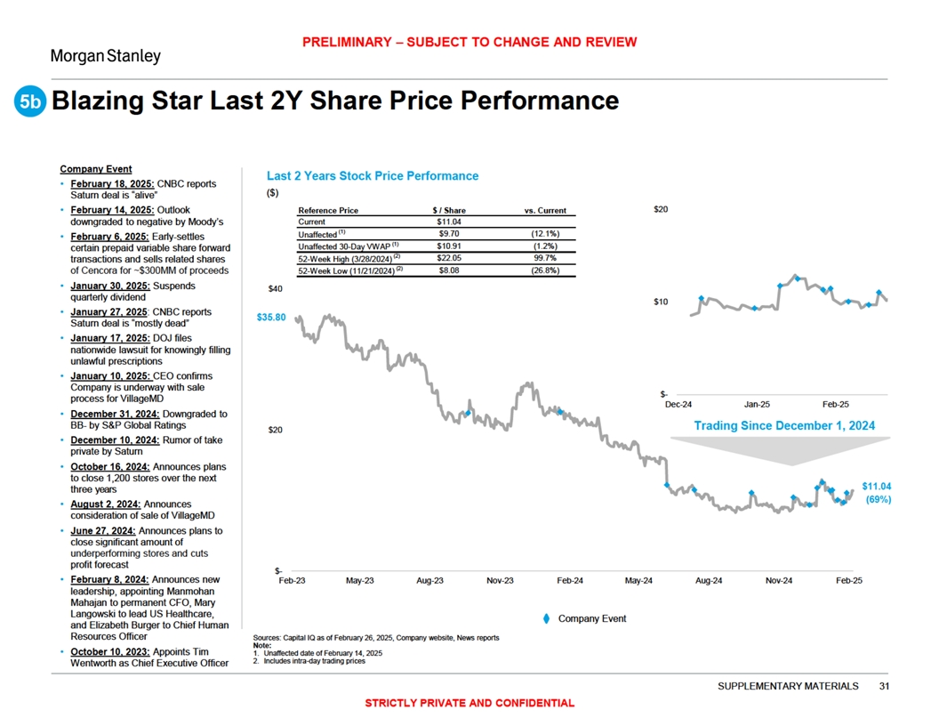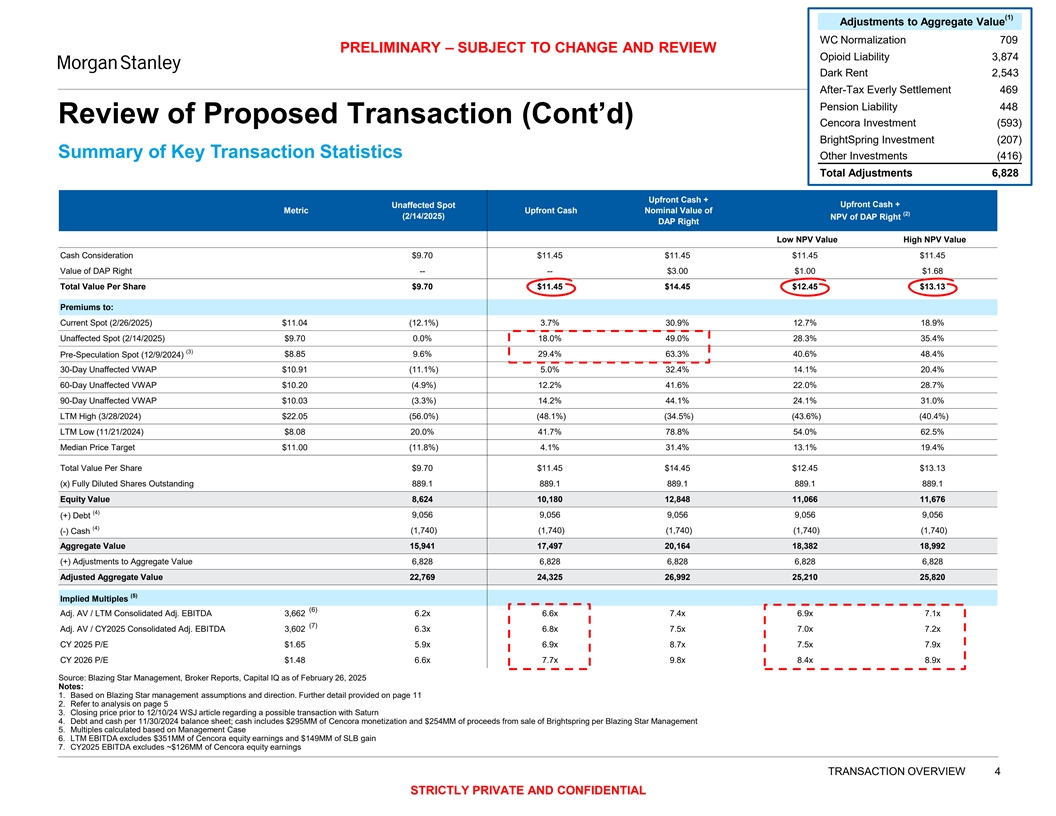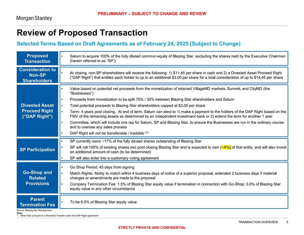 初步–根据截至2025年2月24日的协议草案(可能有变动)对拟议交易的选定条款进行修改和审查审查提议• Saturn收购Blazing Star的100%完全稀释普通股股权,不包括执行主席(以下简称“SP”)持有的股份交易对价至•在收盘时,非SP股东将获得以下收益:1)每股11.45美元现金和2)被剥离的资产收益权非SP(“DAP权利”),每个持有人有权获得每股最多额外3.00美元,总对价最高为每股股东14.45美元•价值基于保留的VillageMD市场货币化的潜在净收益,Summit,和CityMD(“业务”)•将在Blazing Star股东和Saturn之间瓜分70%/30%的货币化收益• Blazing Star股东的潜在总收益上限为每股3.00美元剥离的资产收益权•期限:交易完成后4年。在任期结束时,Saturn可以选择1)根据独立投资银行确定的剩余资产的FMV向行动党权利持有人付款或2)将任期再延长1年(“行动党权利”)•委员会,其中将包括Saturn、SP和Blazing Star的一名代表,确保业务在正常过程中运行并监督任何销售过程(1)• DAP权利将不会被转让/交易• SP目前拥有Blazing Star已发行完全稀释股份的约17% • SP将100%现有股份滚动到收盘后的Blazing Star,预计将拥有该实体的[~X % ],并且还将向SP参与投资额外金额的现金(待定)• SP还将订立惯常的投票协议• Go Shop期限:自签署Go-Shop起45天且• Match Rights:在收到上级提案的通知后4个工作日内,Ability匹配,如提案相关条款发生重大变化或修订,则延长2个工作日•公司终止费:若与Go-Shop相关而终止,则为Blazing Star股权价值的1.5%;在任何其他情况下,为Blazing Star股权价值的3.0%母公司•为Blazing Star股权价值的6.5%终止费来源:Blazing Star Management注:1。根据行动党权利协议下的许可转让除外交易概述3严格私人和保密