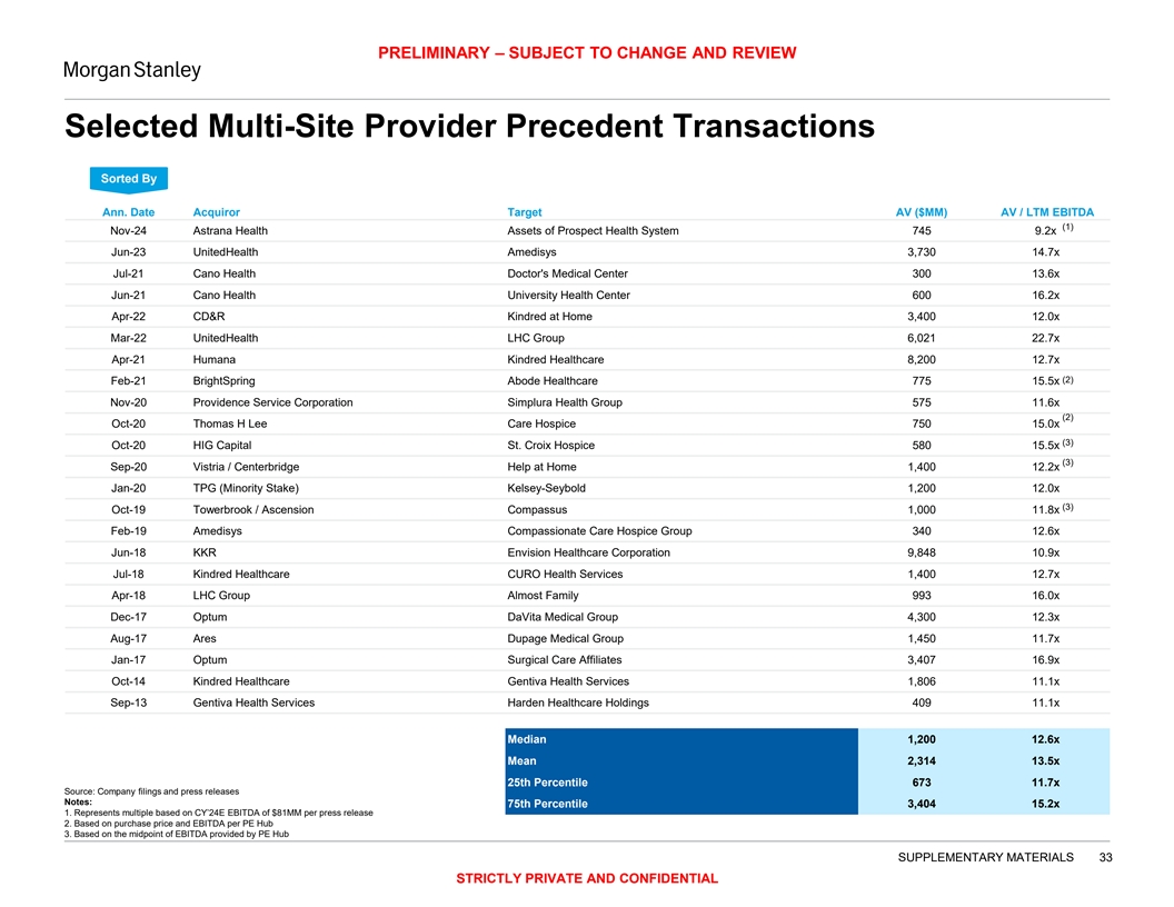 Preliminary – subject to change and review selected multi-site provider precedent transactions sorted by Ann。日期收购Prospect Health System的Target AV($ MM)AV/LTM EBITDA(1)Nov-24 Astrana Health Assets of Prospect Health System 745 9.2x Jun-23 UnitedHealth 阿米斯医疗 3,730 14.7x Jul-21 Cano Health Doctor ' Medical Center 30013.6x Jun-21 Cano Health University Health Center 60016.2x Apr-22 CD & R Kindred at Home 3,40012.0x Mar-22 UnitedHealth LHC集团 6,021 22.7x Apr-21 TERM0哈门那金德里德保健 8,200 12.7x(2)Feb-21 BrightSpring Abode Healthcare 77515.5x Nov-20 Providence Service Corporation Simplura Health Group 57511.6x(2)Oct-20Help at Home 1,40012.2x Jan-20 TPG(少数股权)Kelsey-Seybold 1,20012.0x(3)Oct-19 Towerbrook/Ascension Compassus 1,00011.8x Feb-19丨Amedisys丨Compassionate Care Hospice Group 340 12.6x Jun-18丨KKR KKR丨远景医疗保健公司Envision Healthcare Corporation丨9,848 10.9x Jul-18丨Kindred Healthcare 金德里德保健TERM4TERMOCURO Health Services 1,40012.7x Apr-18丨LHC Group LHC集团TERM6丨Almost Family 阿莫斯特家庭保健Surgical Care93 16.0x Dec-17 Optum丨达维塔丨达维塔保健医疗集团4,30012.3x Aug-17 Ares Dupage医疗集团1,45011.7x Jan-17 Optum丨外科公司文件和新闻稿说明:第75个百分位3,404 15.2x1。表示基于CY'24E EBITDA的倍数,每份新闻稿2为81mm美元。基于购买价格和EBITDA每PE枢纽3。基于PE Hub Supplementary Materials提供的EBITDA的中点33严格私人和保密