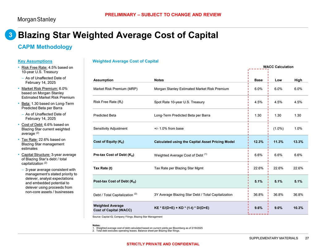 初步–可能会发生变化和审查3 Blazing Star加权平均资本成本CAPM方法关键假设加权平均资本成本WACC计算•无风险利率:4.5%,基于10年期美国国债–截至未受影响的假设日期票据基数低点高点2月14日,2025 •市场风险溢价:6.0%市场风险溢价(MRP)摩根士丹利基于摩根士丹利估计的市场风险溢价6.0% 6.0% 6.0% 10年期美债即期利率4.5% 4.5% 4.5% f • Beta:1.30基于每Barra的长期预测Beta –截至预测Beta的未受影响日期每Barra的长期预测Beta 1.30 1.30 2月14日,2025 •债务成本:6.6%,基于敏感性调整+/-1.0 % from base(1.0%)1.0% Blazing Star current加权(2)平均•税率:22.6%,基于股权成本(K),使用资本资产定价模型计算12.3% 11.3% 13.3% E Blazing Star管理层估计(1)•资本结构Structure:3年平均税前债务成本(K)6.6% 6.6% 6.6% Blazing Star债务加权平均成本D/总债务(2)资本化率税率(t)每Blazing Star MGMT税率22.6% 22.6% 22.6% – 3年平均与管理层声明的优先去杠杆一致,分析师预期税后债务成本(K)5.1% 5.1% 5.1% D和内嵌的使用非核心资产/业务收益去杠杆的潜力(2)3年平均炽热明星债务/总资本36.8% 36.8% 36.8%债务/总资本加权平均贝壳*E/(d + e)+ KD*(1-t)*D/(D + E)9.6% 9.0% 10.3%资本成本(WACC)资料来源:Capital IQ,Company Filings,Blazing Star Management Notes:1。根据截至2025年2月18日彭博当前收益率计算的加权平均债务成本2。总债务不包括经营租赁。每Blazing Star文件的资产负债表。补充材料27严格保密