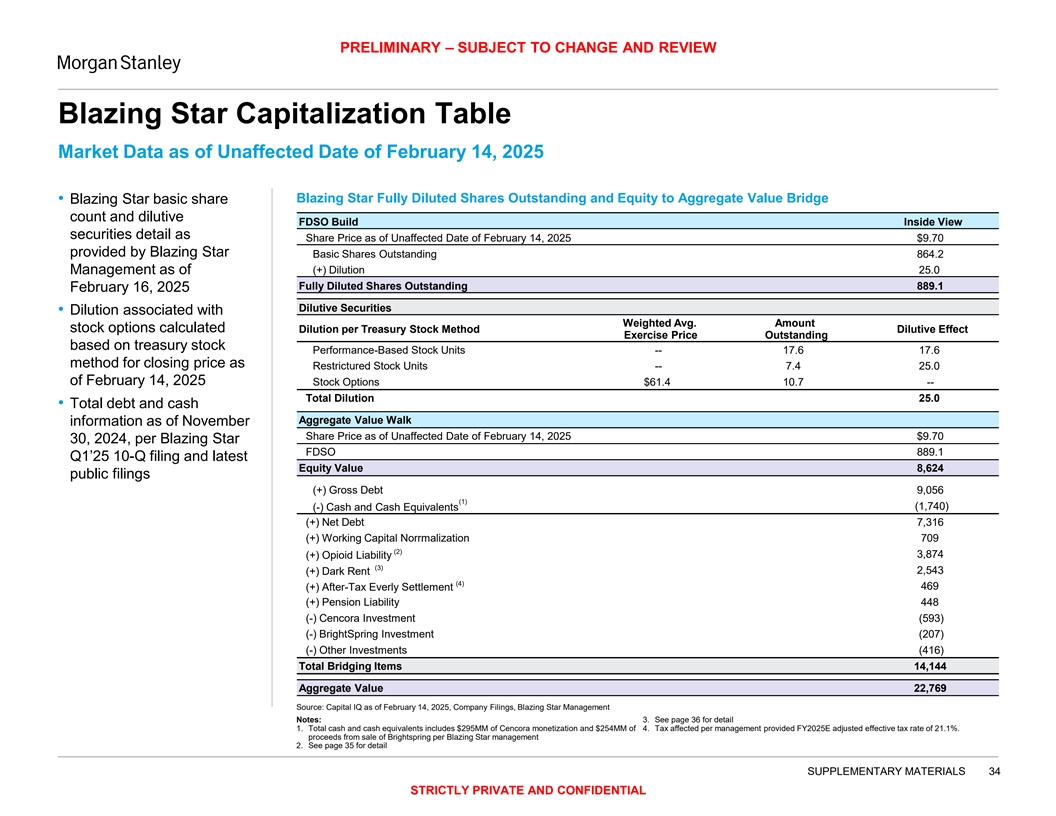 初步–可能更改并审查Blazing Star资本化表格截至2025年2月14日未受影响日期的市场数据Blazing Star已发行完全稀释股份和权益汇总价值桥• Blazing Star基本股份数量和稀释性FDSO Build Inside View证券详情为截至2025年2月14日未受影响日期的股价9.70美元由Blazing Star基本股份提供已发行864.2(+)稀释25.0管理层截至2025年2月16日已发行完全稀释股份889.1稀释证券•与加权平均相关的稀释。金额股票期权计算稀释每库存股方法稀释效应行使价基于库存股基于绩效的股票单位--17.6 17.6作为限制性股票单位的收盘价方法--7.4 25.0 2025年2月14日股票期权61.4 10.7美元--总稀释25.0 •截至11月的总债务和现金总价值Walk信息截至2025年2月14日未受影响日期的股价9.7030美元,2024年,每Blazing Star FDSO 889.1 Q1’25 10-Q申报和最新股权价值8,624公开申报(+)总债务9,056(1)(-)现金和现金等价物(1,740)(+)净债务7,316(+)营运资本正常化709(2)(+)阿片类药物负债3,874(3)(+)暗租金2,543(4)(+)税后Everly结算469(+)养老金负债448(-)Cencora Investment(593)(-)BrightSpring Investment(207)(-)其他投资(416)总桥接项目14,144总价值22,769资料来源:Capital IQ截至2025年2月14日,公司备案,Blazing Star Management注:3。详见第36页1。现金和现金等价物总额包括2.95亿美元的Cencora货币化和2.54亿美元的4。每名管理层提供的税项受影响FY2025E调整后有效税率为21.1%。每名Blazing Star管理层出售Brightspring的收益2。详见第35页补充材料34严格保密