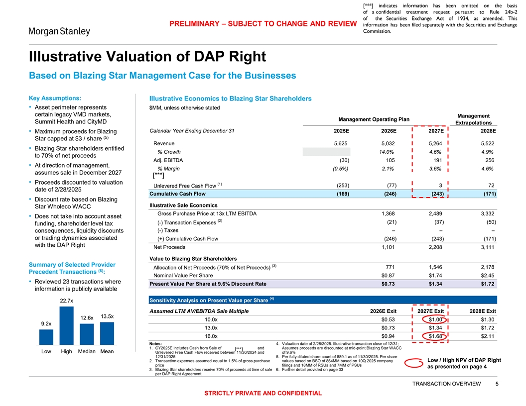 [***]表示根据经修订的1934年《证券交易法》第24b-2条,根据保密处理请求遗漏了信息。这份初步–须予更改和审查的信息已分别向美国证券交易委员会备案。基于Blazing Star管理层案例对业务进行的DAP权利的说明性估值关键假设:对Blazing Star股东的说明性经济学•资产周长代表MM美元,除非另有说明,某些传统的VMD市场、管理层管理运营计划Summit Health和CityMD外推日历年度截至2025年12月31日2026E 2027E 2028E • Blazing(5)Star的最高收益上限为3美元/股收入5,6255,0325,2645,522 • Blazing Star股东有权获得经调整后净收益的70%增长率14.0% 4.6% 4.9%至70% EBITDA(30)105191256 •在管理层的指导下,%利润率(0.5%)2.1% 3.6% 4.6%假设2027年12月出售[***】•与估值折现的收益(1)(253)(77)372无杠杆自由现金流日期2/28/2025累计现金流(169)(246)(243)(171)•基于Blazing Illustrative Sale Economics Star Wholeco WACC毛购买价格的折现率,按13倍LTM EBITDA 1,3682,4893,332 •未考虑资产(2)(-)交易费用(21)(37)(50)资金、股东层面税收(----后果,流动性贴现或与(+)累积现金流(246)(243)(171)相关的交易动态与行动党权利净收益1,1012,2083,111对Blazing Star股东的价值选定提供商摘要(3)7711,5462,178净收益分配(净收益的70%)(6)先前交易:每股名义价值$ 0.87 $ 1.74 $ 2.45 •审查了23笔交易其中以9.6%贴现率计算的每股现值0.73美元1.34美元1.72美元的信息是公开的(4)22.7倍的每股现值敏感性分析假设LTM AV/EBITDA出售倍数2026E退出2027E退出2028E退出13.5x 12.6x 10.0x 0.53美元1.00美元1.30美元9.2x 13.0x 0.73美元1.34美元1.72美元16.0x 0.94美元1.68美元2.11注:4。估值日期为2025年2月28日。说明性交易收盘12/31;1。CY2025E包括出售现金并假设收益按中点炽热之星WACC [***】在2024年11月30日至2025年12月31日期间收到的低、高中位数平均无杠杆自由现金流为9.6% 5。截至2025年11月30日,每股全面摊薄股数为889.1。每股2。交易费用假设等于总采购价值的1.5%,基于864mm的BSO,基于2025年10Q公司DAP Right Price备案的低/高NPV和18mm的RSU和7mm的PSU,如第4页3所示。Blazing Star股东在出售时获得70%的收益6。更多详情,请参见第33页,每份行动党权利协议交易概览5严格保密和保密
