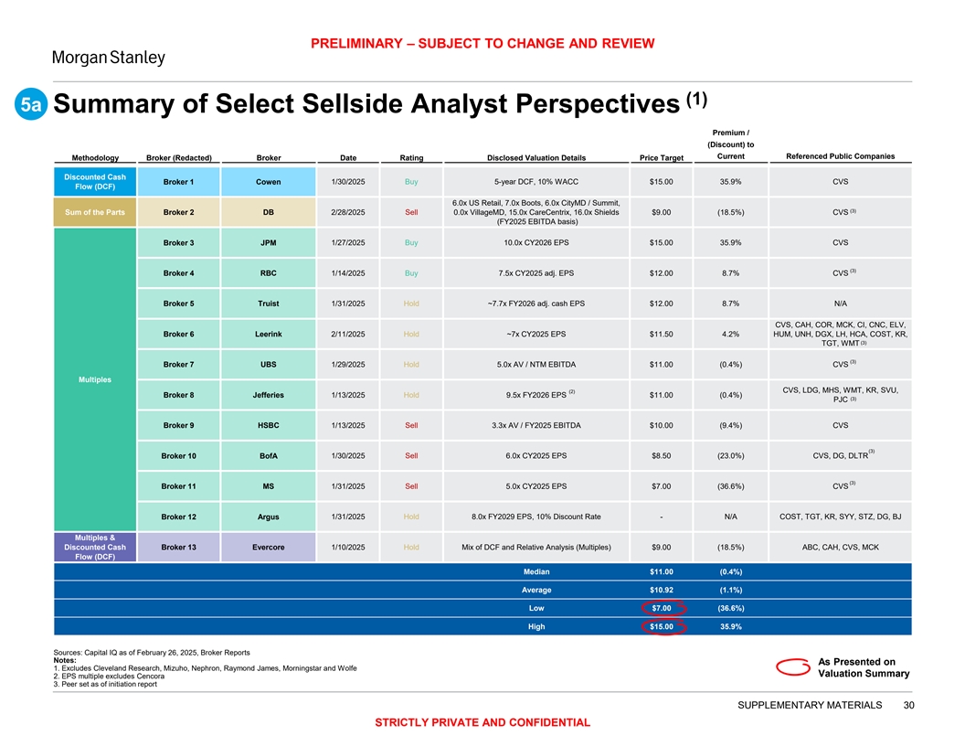 初步–可能会发生变化并接受审查(1)5a选择卖方分析师观点的摘要对当前参考上市公司的溢价/(折价)方法论Broker(Redacted)Broker日期评级披露估值详情价格目标折价现金1/30/2025买入5年期DCF,10% WACC $ 15.00 35.9% CVS经纪商1 丨高宏集团 Flow(DCF)6.0x美国零售,7.0x Boots,6.0x CityMD/Summit,(3)零件经纪商的总和2 DB 2/28/2025卖出0.0x VillageMD,15.0x CareCentrix,16.0x Shields $ 9.00(18.5%)CVS(FY2025EBITDA基础)Broker 3 JPM 1/27/2025买入10.0x CY2026 EPS $ 15.00 35.9% CVS(3)Broker 4 RBC 1/14/2025买入7.5x CY2025 adj. EPS $ 12.008.7% CVS Broker 5 Truist 1/31/2025持有~7.7x FY2026 adj.现金EPS $ 12.008.7% N/A TERM0CVS,CAH,COR,MCK,CI,CNC,ELV,Broker 6 Leerink 2/11/2025持有~7x CY2025 EPS $ 11.50 4.2% HUM,UNH,TERM0 DGX(2)经纪商8 Jefferies 1/13/2025持有9.5x FY2026 EPS $ 11.00(0.4%)(3)PJC经纪商9 HSBC 1/13/2025卖出3.3x AV/FY2025 EBITDA $ 10.00(9.4%)CVS(3)经纪商10 BoFA 1/30/2025卖出6.0x CY2025 EPS $ 8.50(23.0%)CVS,DG,DLTRTERM2(3)经纪商11 MS 1/31/2025卖出5.0x CY2025 EPS $ 7.00(36.6%)CVS经纪商12 Argus 1/31/2025持有8.0x FY2029 EPS,10%贴现率-N/A成本,TGT,KR,丨SYYMCK流量(DCF)中值11.00美元(0.4%)平均10.92美元(1.1%)低值7.00美元(36.6%)高值15.00美元35.9%资料来源:Capital IQ截至2025年2月26日,经纪人报告注:如1所示。不包括Cleveland Research、瑞穗、Nephron、Raymond James、晨星信息和Wolfe估值摘要2。EPS倍数不包括Cencora 3。Peer set as of initiation report supplementary materials 30 strictly private and confidential