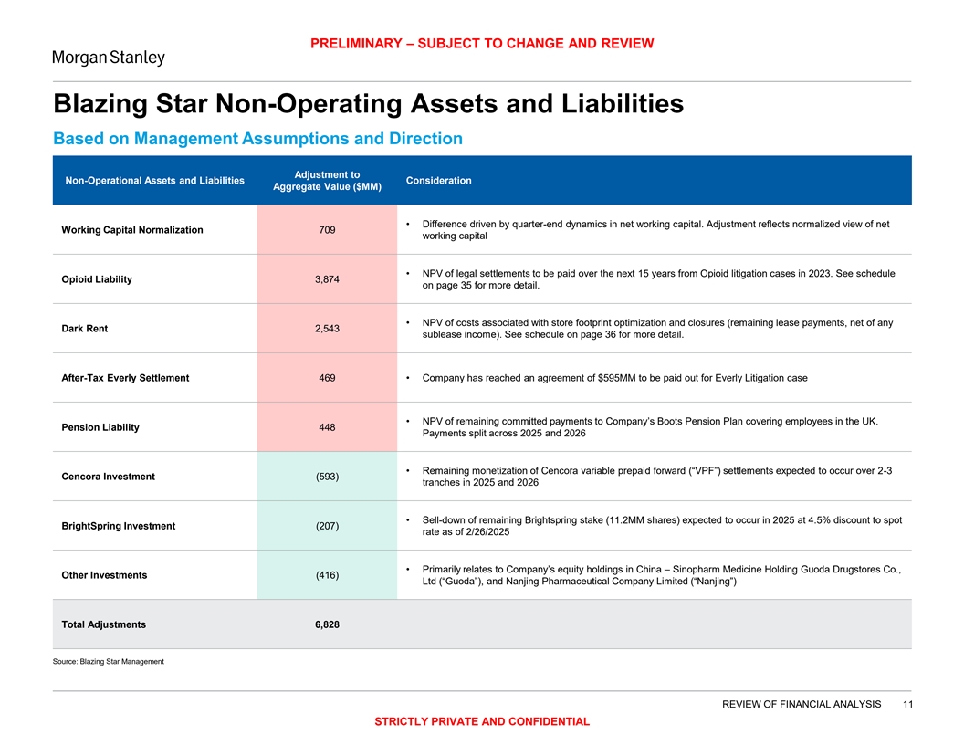 初步–将根据管理层假设和方向调整对非经营性资产和负债对价总价值(百万美元)进行更改和审查Blazing Star非经营性资产和负债•净营运资本季度末动态驱动的差异。调整反映了对净营运资本正常化的看法709营运资本• 2023年阿片类药物诉讼案件将在未来15年支付的法律和解的NPV。有关详细信息,请参见第35页的附表阿片类药物责任3,874。•与商店足迹优化和关闭相关的成本NPV(剩余租赁付款,扣除任何暗租2543转租收入)。更多详情,请参见第36页的日程安排。税后Everly和解469 •公司已达成一项595mm美元的协议,将为Everly诉讼案支付•覆盖英国员工的公司Boots养老金计划剩余承诺付款的NPV。养老金负债448笔付款分拆至2025年和2026年• Cencora可变预付远期(“VPF”)的剩余货币化结算预计将在2025年和2026年的2-3笔Cencora Investment(593)中发生•预计将在2025年以截至2025年2月26日现货BrightSpring Investment(207)利率的4.5%折让出售剩余的BrightSpring股权(11.2mm股份)•主要涉及公司在中国持有的股权–国药控股国大药房有限公司、Other Investments(416)Ltd(“国大”),和南京医药股份有限公司(“南京”)合计调整6,828资料来源:Blazing Star Management Review of Financial Analysis 11 Strictly Private and Confidential