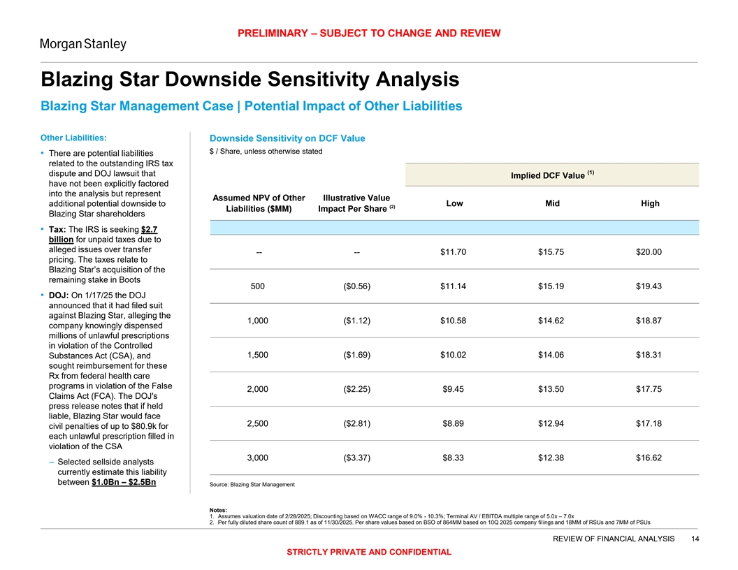 初步–可能发生变化并审查Blazing Star下行敏感性分析Blazing Star管理案例|其他负债的潜在影响其他负债:对DCF价值的下行敏感性$/share,除非另有说明•存在与未决IRS税(1)纠纷和DOJ诉讼相关的潜在负债,其中隐含的DCF值未被明确纳入分析,但代表其他说明性价值的假设NPV额外潜在下行至低中高(2)负债($ MM)每股影响Blazing Star股东•税收:IRS因涉嫌转让问题而寻求27亿美元的未缴税款---11.70美元15.75美元20.00美元的定价。税款与Blazing Star收购Boots 500剩余股份(0.56美元)11.14美元15.19美元19.43美元• DOJ:1/17/25 DOJ宣布已对Blazing Star提起诉讼,指控这家1000美元(1.12美元)10.58美元14.62美元18.87美元的公司违反受控的1,500(1.69美元)10.02美元14.06美元18.31美元物质法案(CSA),并违反虚假的2,000(2.25美元)9.45美元13.50美元17.75美元索赔法案(FCA),并要求联邦医疗保健计划为这些RX进行报销。美国司法部的新闻稿指出,如果被追究责任,Blazing Star将面临2,500(2.81美元)8.89美元12.94美元17.18美元的民事罚款,每一张非法处方的填写违反了CSA 3,000(3.37美元)8.33美元12.38美元16.62美元–选定的卖方分析师目前估计这一负债在10 – 25亿美元之间来源:Blazing Star Management注:1。假设估值日期为2/28/2025;基于WACC区间9.0%-10.3%的折现;终端AV/EBITDA倍数区间为5.0x – 7.0x 2。截至2025年11月30日,每股全面摊薄股数为889.1。基于BSO的每股价值为864mm基于10Q 2025公司备案和18mm的RSU和7mm的PSU审查财务分析14严格私人和保密
