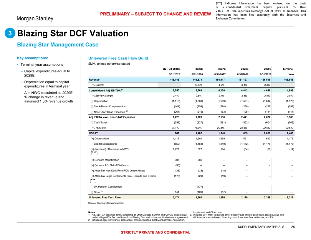 [***]表示根据经修订的1934年《证券交易法》第24b-2条规定的保密处理请求,信息已被省略。这份初步–须予更改和审查的信息已分别向美国证券交易委员会备案。管理层现金流预测摘要Blazing Star Management Case Unlevered Free Cash Flow Build $ MM,除非另有说明管理层运营计划管理层外推截至8月31日的财政年度Q2-Q4 2025E 2026E 2027E 2028E 2029E Revenue 115,146149,874155,917161,197166,548% YoY Growth(3.0%)4.0% 3.4% 3.3%(1)Consolidated Adj. EBITDA 2,7503,7634,1364,4424,696% Margin 2.4% 2.5% 2.7% 2.8% 2.8%(-)折旧(1,116)(1,560)(1,569)(1,591)(1,612)(-)基于股票的薪酬(144)(259)(274)(286)(297)(2)(264)非美国通用会计准则费用1,2261,7282,1302,4412,672%利润率1.1% 1.2% 1.4% 1.5% 1.6%(-)税项(259)(327)(481)(552)(604)%有效税率21.1% 18.9% 22.6% 22.6% 22.6% NOPAT 9671,4021,6481,8892,068(+)折旧1,1161,5601,5691,5911,612(-)资本支出(859)(1,163)(1,210)(1,172)(+)(增加)/减少NWC 1,727527194(54)(30)[***](+)Cencora Monetization 307286 – ––(+)Cencora AOI净股息(98)–– ––(+)税后非暗租金ROU租赁资产(33)(33)(18)––(+)税后法律和解(不包括。阿片类药物和艾佛利)(173)(20)(19)–– [***](-)英国养老金缴款–(437)–– –(3)(-)其他141(109)(57)––无杠杆自由现金流3,1741,8621,8762,1792,399资料来源:Blazing Star Management注:1。根据VillageMD向Blazing Star提供的担保贷款和随后的宽容协议2,鉴于违约,Adj. EBITDA承担了VMD Markets、Summit和CityMD的100%所有权。包括法律、遣散费、顾问、转型成本管理、收购、减值和其他成本3。包括国库、外汇、反稀释股份购买,以及其他审查财务分析10严格私人和保密