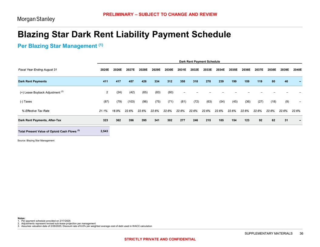 初步–须予更改及检讨Blazing Star Dark Rent Liability Payment Schedule(1)每Blazing Star Management Dark Rent Payment Schedule截至8月31日财政年度2025E 2026E 2027E 2028E 2029E 2030E 2031E 2032E 2033E 2034E 2035E 2036E 2037E 2039E 2040E Dark Rent Payments 4114174574263343123583182782391991591198040 –(2)2(24)(42)(65)(83)(60)–– –– –– –– ––(+)租赁回购调整(-)税项(87)(79)(103)(96)(75)(71)(81)(72)(63(9)–%有效税率21.1% 18.9% 22.6% 22.6% 22.6% 22.6% 22.6% 22.6% 22.6% 22.6% 22.6% 22.6% 22.6% 22.6% 22.6% 22.6% 22.6%暗租金支付,税后323362396395341302277246215185154123926231 –(3)阿片类药物现金流总现值2,543资料来源:Blazing Star Management注:1。根据2/17/20252提供的付款时间表2。调整代表修订后的每名管理层的分租预测3。假设估值日期为2/28/2025;WACC计算中使用的加权平均债务成本贴现率为6.6%补充材料36严格私人和机密