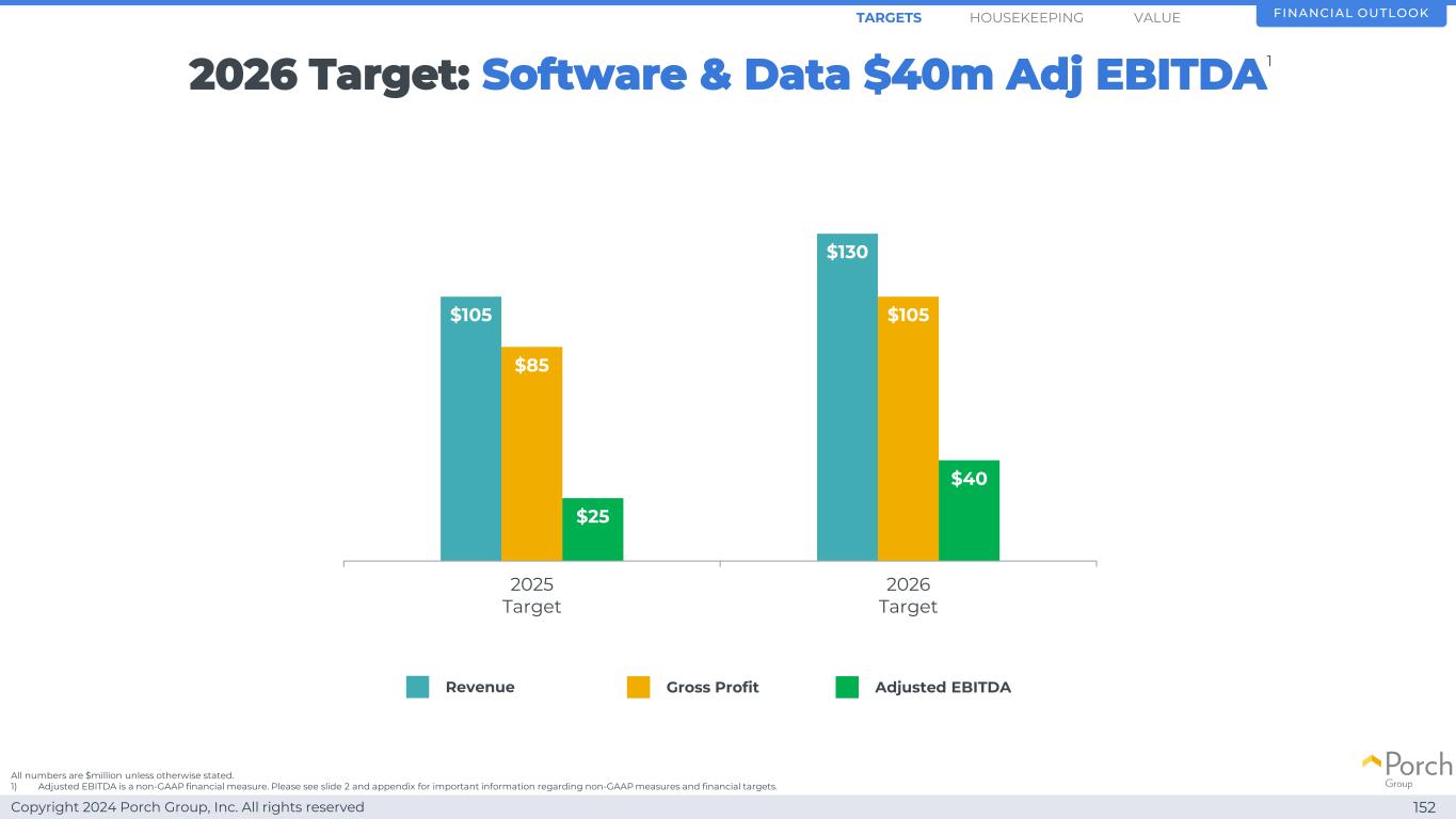 Copyright 2024 Porch Group, Inc. All rights reserved $ 105 $ 130 $ 85 $ 105 $ 25 $ 40 2025 Target 2026 Target 2026 Target:Software & Data $ 4000万Adj EBITDA 152 Financial OutlookHOUSEKePING Revenue Gross Profit Adjusted EBITDA TARGETS除非另有说明,否则所有数字均为百万美元。1)调整后EBITDA是一种非GAAP财务指标。有关非GAAP措施和财务目标的重要信息,请参见幻灯片2和附录。值1