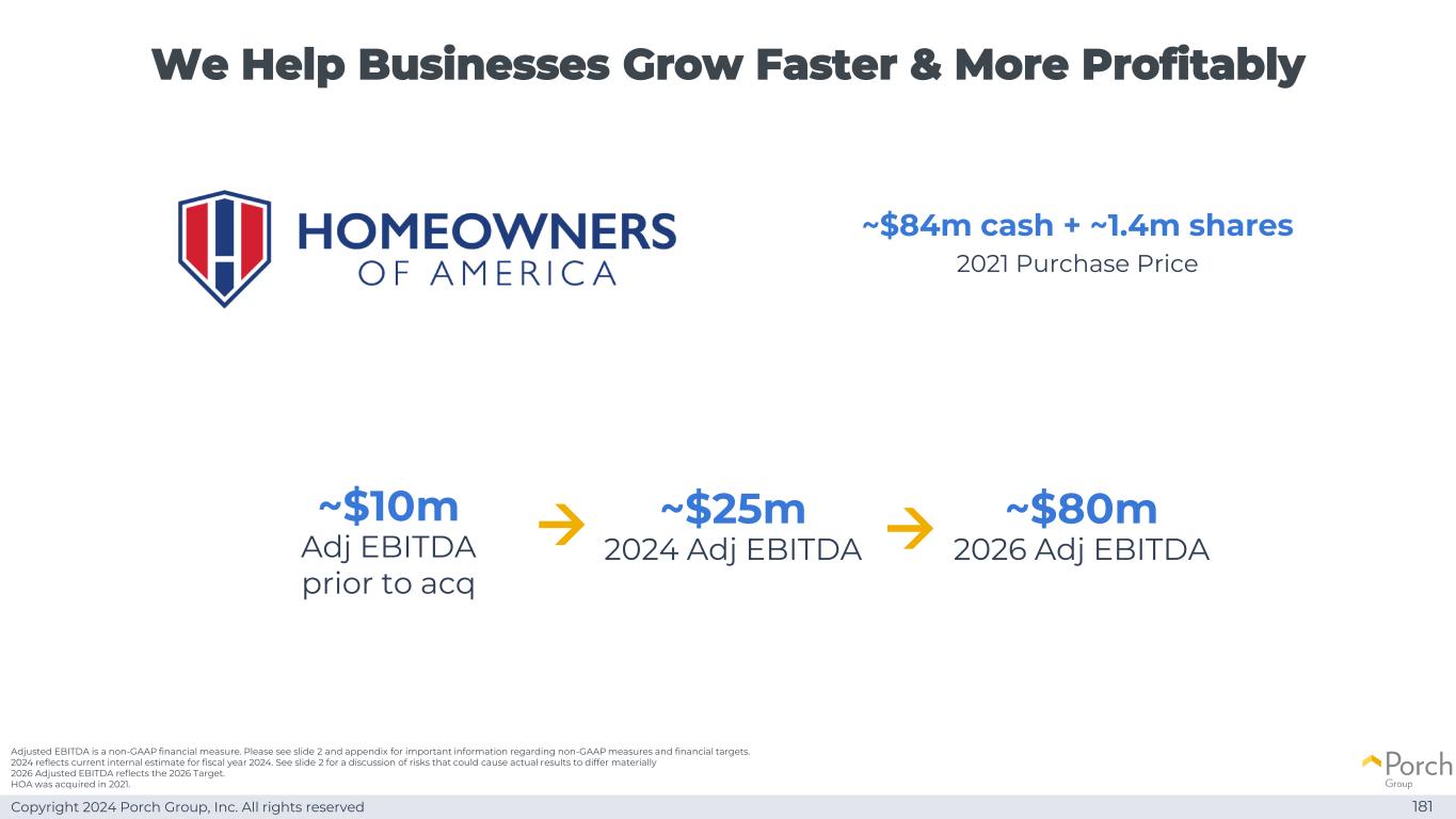 Copyright 2024 Porch Group, Inc. All rights reserved We help businesses grow faster & more profitable 1.81~8400万美元现金+~140万股2021 purchase price adjusted EBITDA is a non-GAAP financial measure。有关非GAAP措施和财务目标的重要信息,请参见幻灯片2和附录。2024年反映了当前对2024财年的内部估计。有关可能导致实际结果出现重大差异的风险的讨论,请参见幻灯片2。2026年调整后EBITDA反映了2026年目标。HOA于2021年被收购。~1000万美元ACQ前调整后EBITDA →~2500万美元2024年调整后EBITDA →~8000万美元2026年调整后EBITDA