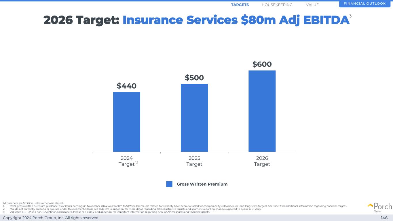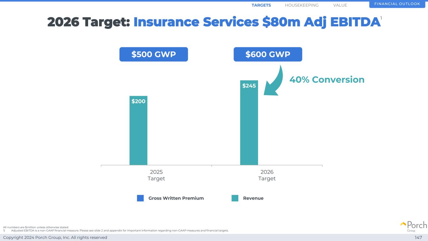 Copyright 2024 Porch Group, Inc. All rights reserved 146 $ 440 $ 500 $ 6002024 Target 2025 Target 2026 Target 2026 Target:Insurance Services $ 8000万Adj EBITDA 1,2 Gross written premium financial outlook HOUSEKEEPINGARGETS除非另有说明,否则所有数字均为百万美元。1)2024年毛保费指引,截至2024年11月的24年第三季度收益,为4.6亿美元至4.7亿美元。为与中长期目标的可比性,已排除与保修相关的保费。有关财务目标的更多信息,请参见幻灯片2。2)我们目前没有在这一细分领域进行指导或操作。有关预计将于2025年第一季度开始的2024年说明性目标和分部报告变化的更多详细信息,请参见附录中的幻灯片197。3)调整后EBITDA是一种非GAAP财务指标。有关非GAAP措施和财务目标的重要信息,请参见幻灯片2和附录。值3