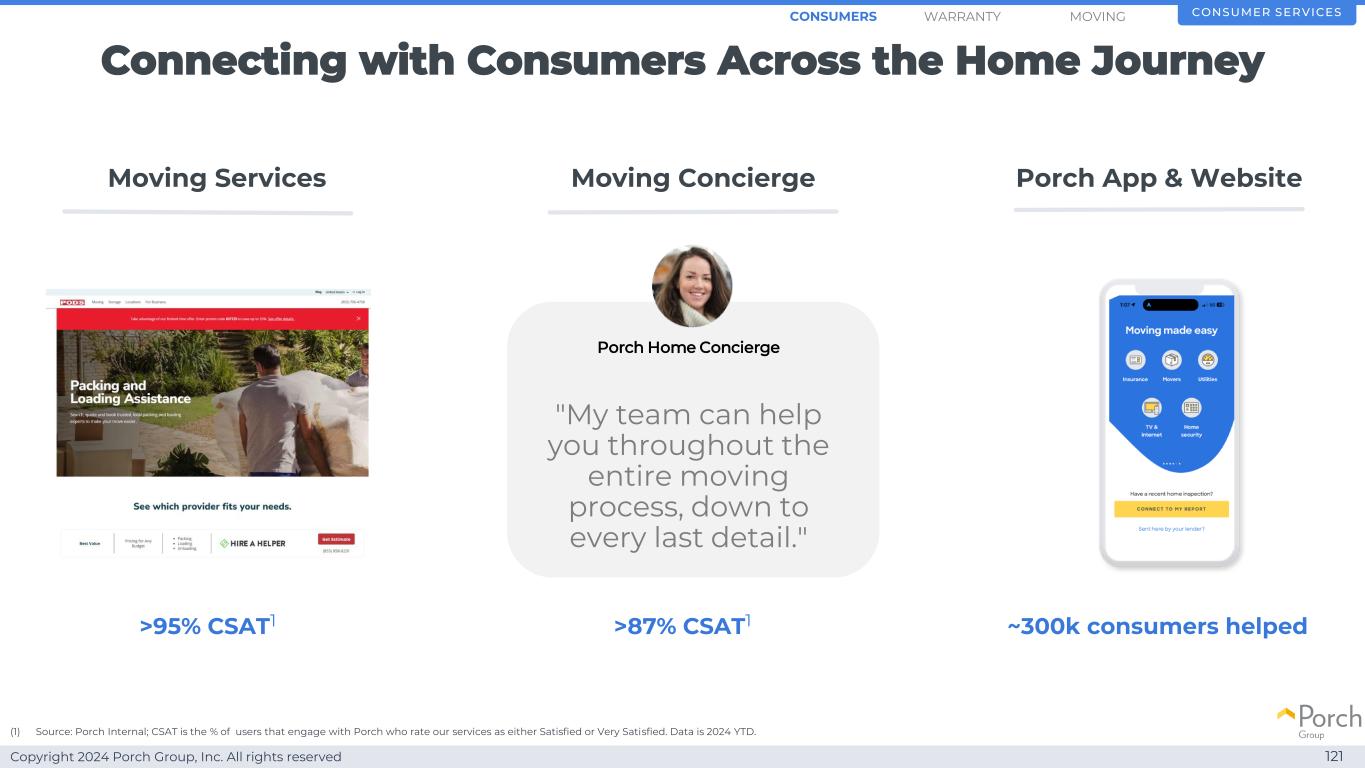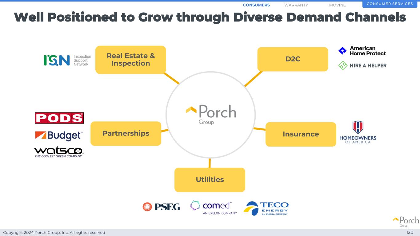 Copyright 2024 Porch Group, Inc. All rights reserved Well positioned to grow through diverse demand channels 120 Real Estate & Inspection D2C Insurance Utilities Partnerships Consumer Service SMOVINGWARRANTYConsumers
