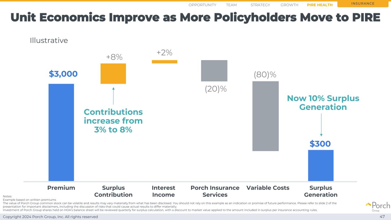 Copyright 2024 Porch Group, Inc. All rights reserved PIRE Target Unit Economics Generate Surplus Organically 46 Notes:说明性示例,基于基于预期单位经济性的书面溢价。Porch Group普通股的价值可能会波动,结果可能与已披露的结果大不相同。你不应该依赖这个例子作为未来业绩的指示或承诺。请参阅演示文稿的幻灯片2,了解重要的免责声明,包括对可能导致实际结果出现重大差异的风险的讨论。在HOA的资产负债表上持有的Porch Group股票的投资将每季度进行一次盈余计算审查,并根据保险会计规则对计入盈余的金额应用市值折让。5%盈余生成保险保费可变成本+ 3% $ 150盈余贡献(20)% $ 3,000利息收入门廊保险服务盈余生成+ 2%(80)%说明性机会战略增长团队PIRE Health