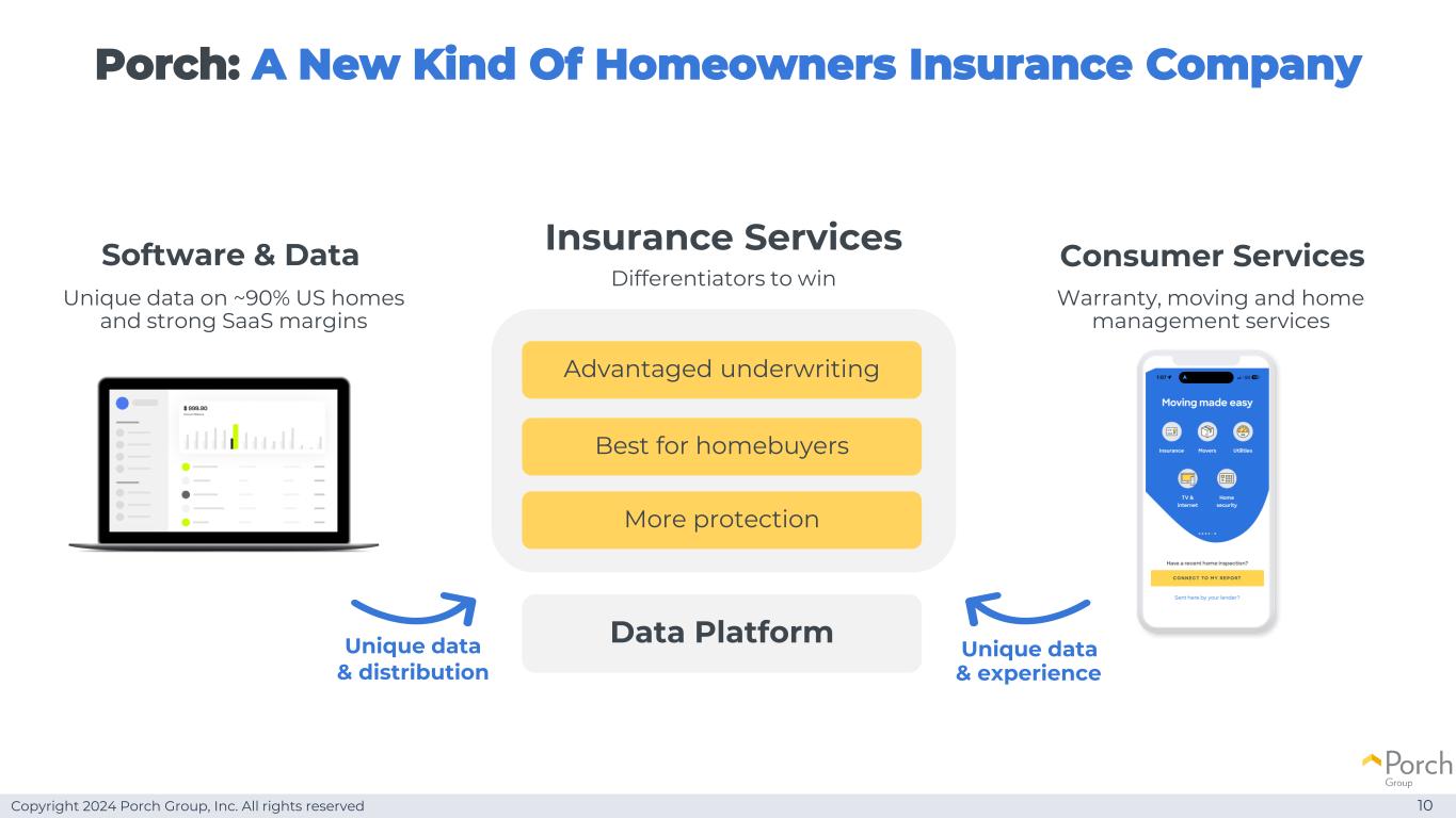 Copyright 2024 Porch Group, Inc. All rights reserved Porch:a new kind of homeowners insurance company 10 warranty,moving and home management services differentiators to win insurance services consumer services best for homebuyers advantageWriting more protection unique data SaaS for home inspection,title,mortgage,and roofing vertical softwareSoftw re & data~90% of US homes unique data and strong SaaS