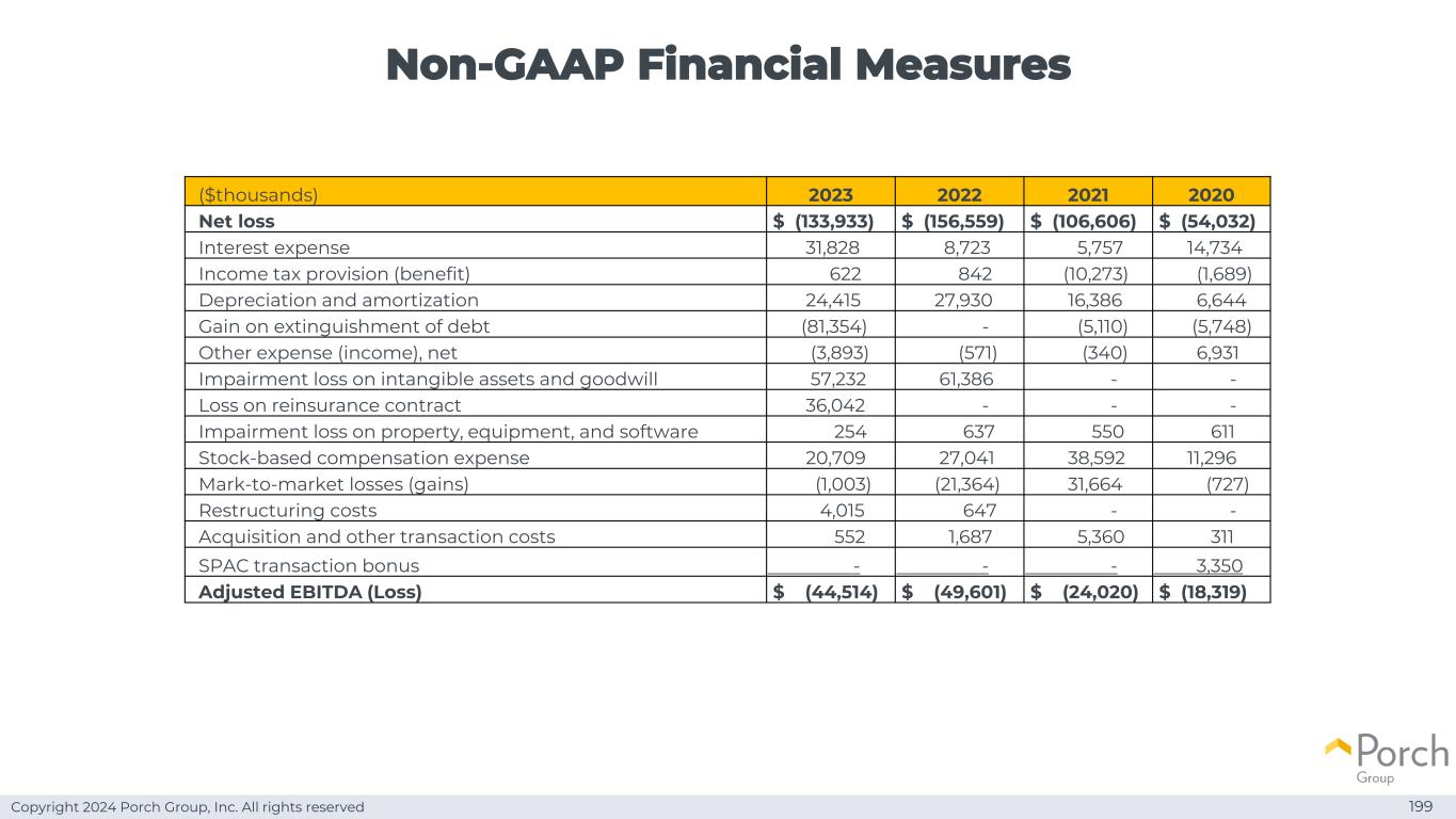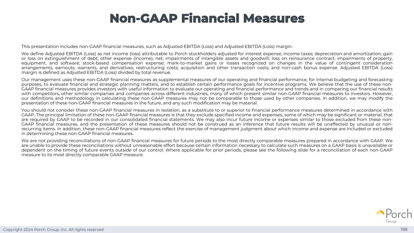 Copyright 2024 Porch Group, Inc. All rights reserved non-GAAP financial measures 198本演示文稿包括non-GAAP financial measures,例如调整后EBITDA(亏损)和调整后EBITDA(亏损)利润率。我们将调整后EBITDA(亏损)定义为经利息费用调整后的归属于Porch股东的净收入(亏损);所得税;折旧和摊销;债务清偿的损益;其他费用(收入),净额;无形资产和商誉减值;再保险合同损失;财产、设备和软件减值;基于股票的补偿费用;或有对价安排、收益、认股权证和衍生工具的价值变动确认的按市值计价的损益;重组成本;收购和其他交易成本;以及非现金红利费用。调整后EBITDA(亏损)利润率定义为调整后EBITDA(亏损)除以总收入。我们的管理层使用这些非公认会计准则财务指标作为我们运营和财务业绩的补充衡量标准,用于内部预算和预测目的,评估财务和战略规划事项,并为激励计划建立某些绩效目标。我们认为,使用这些非GAAP财务指标为投资者提供了有用的信息,以评估我们的经营和财务业绩和趋势,并将我们的财务业绩与竞争对手、其他类似公司和不同行业的公司进行比较,其中许多公司向投资者提供了类似的非GAAP财务指标。然而,我们在计算这些非GAAP衡量标准时的定义和方法可能无法与其他公司使用的定义和方法进行比较。此外,我们可能会在未来修改这些非GAAP财务指标的列报方式,任何此类修改都可能是重大的。您不应该孤立地考虑这些非GAAP财务指标,作为根据GAAP确定的财务业绩指标的替代或优于。这些非GAAP财务指标的主要限制是,它们不包括特定的收入和支出,其中一些可能是重大的或重大的,GAAP要求将其记录在我们的合并财务报表中。我们还可能产生与这些非GAAP财务指标排除的收入或支出类似的未来收入或支出,这些指标的列报不应被解释为未来业绩将不受异常或非经常性项目影响的推断。此外,这些非GAAP财务指标反映了管理层在确定这些非GAAP财务指标时对哪些收入和费用被包括或排除的判断的行使。我们不提供未来期间非GAAP财务指标与根据GAAP编制的最直接可比指标的对账。我们无法在没有不合理努力的情况下提供这些对账,因为无法获得根据GAAP计算此类措施所需的某些信息,或者取决于我们无法控制的未来事件的发生时间。在适用于以往期间的情况下,请看下面的幻灯片,了解每个非GAAP衡量标准与其最直接可比的GAAP衡量标准的对账情况。