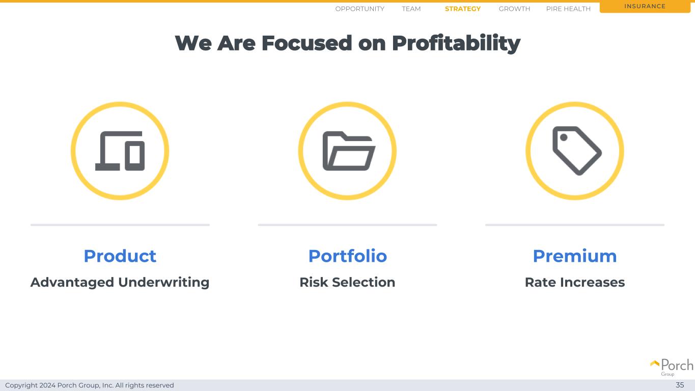 Copyright 2024 Porch Group, Inc. All rights reserved We are focusing on profitability 35 insurance premium rate increases product advantaged underwriting portfolio risk selection opportunity strategy growthteam PIRE health