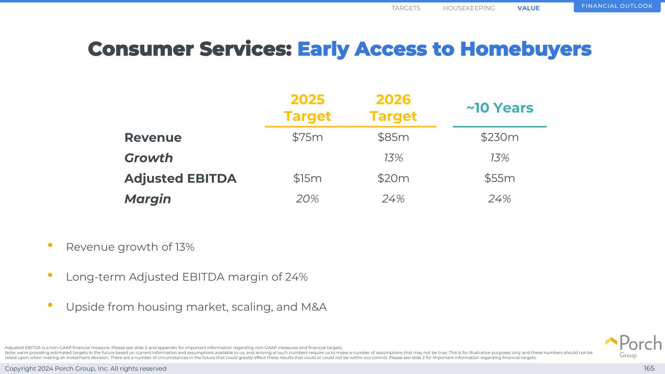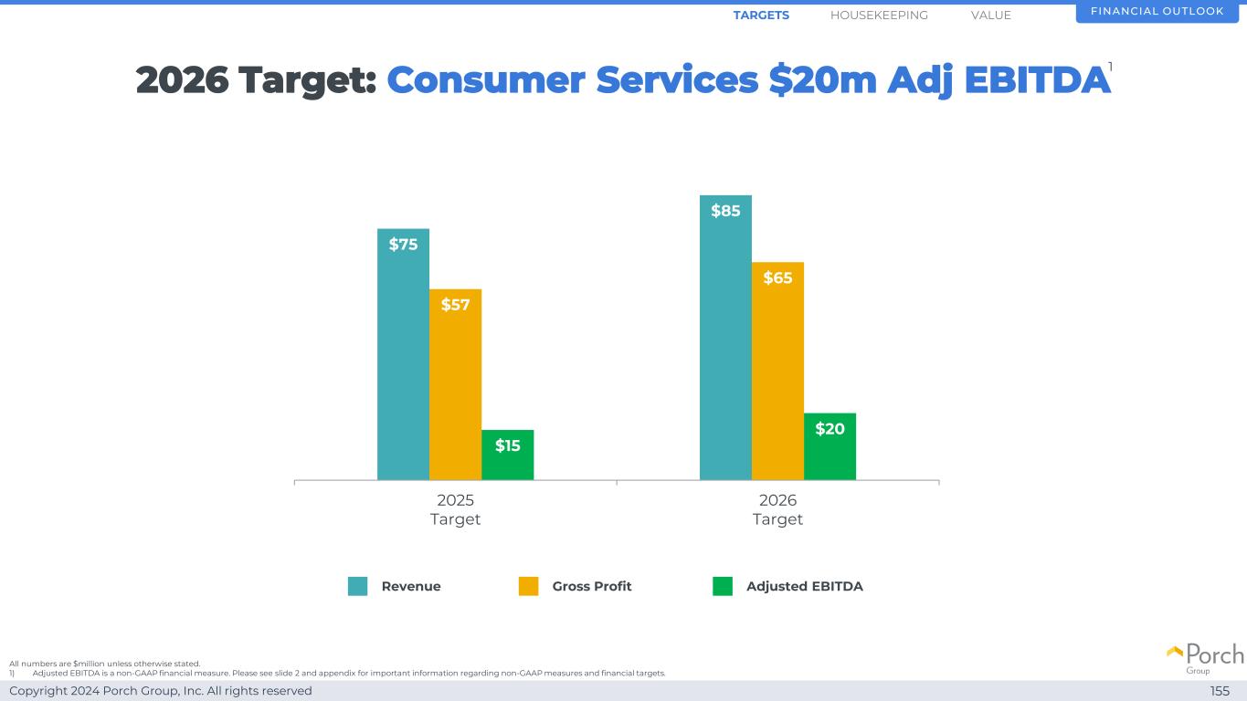 Copyright 2024 Porch Group, Inc. All rights reserved 155 $ 75 $ 85 $ 57 $ 65 $ 15 $ 202025 target 2026 target revenue gross profit adjusted EBITDA financial outlookHOUSEKEEPINGARGETS除非另有说明,否则所有数字均为百万美元。1)调整后EBITDA是一种非GAAP财务指标。有关非GAAP措施和财务目标的重要信息,请参见幻灯片2和附录。价值2026年目标:消费者服务2000万美元Adj EBITDA 1