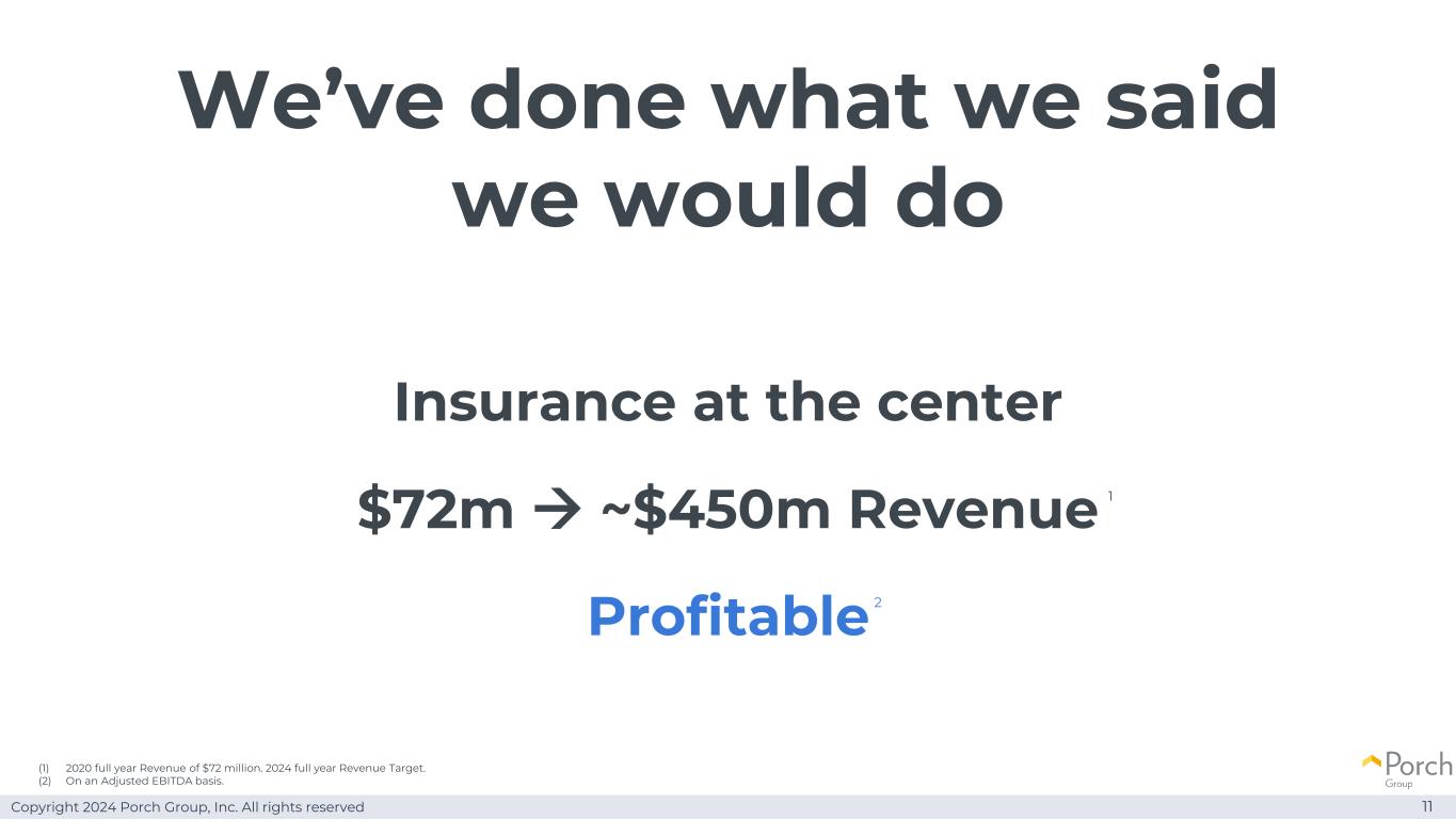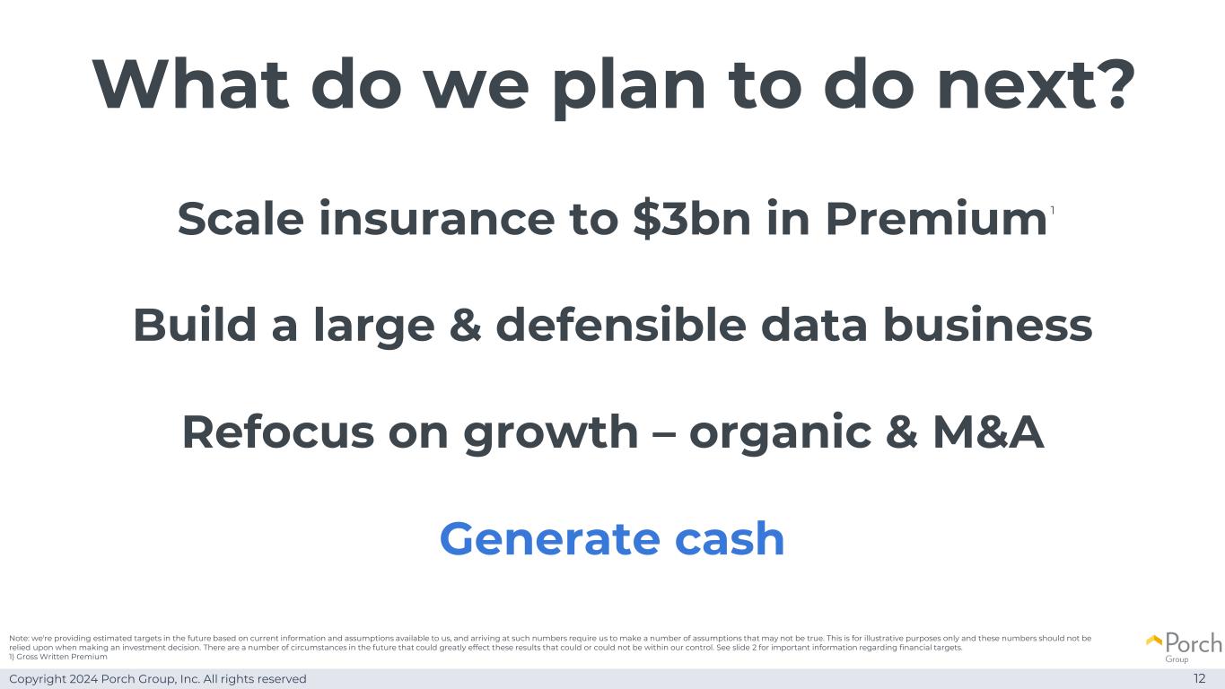 Copyright 2024 Porch Group, Inc. All rights reserved 11 Insurance at the center We’ve done what we said we would do $ 7200万→~$ 4.5亿revenue profitable(1)2020 full year revenue of $ 7200万。2024年全年收入目标。(2)按经调整EBITDA基准。1 2