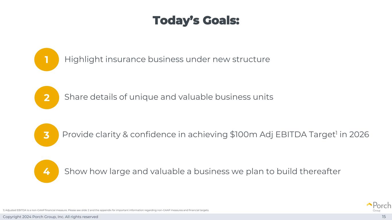 Copyright 2024 Porch Group, Inc. All rights reserved Today’s goals:15 share details of unique and valuable business subjects Provide clearance & confidence to achieve $ 1 million Adj EBITDA target1 in 2026 Highlight insurance business under new structure1 32 show how large and valuable a business we plan to build after 41)Adjusted EBITDA is a non-GAAP financial measure。有关非GAAP措施和财务目标的重要信息,请参见幻灯片2和附录。