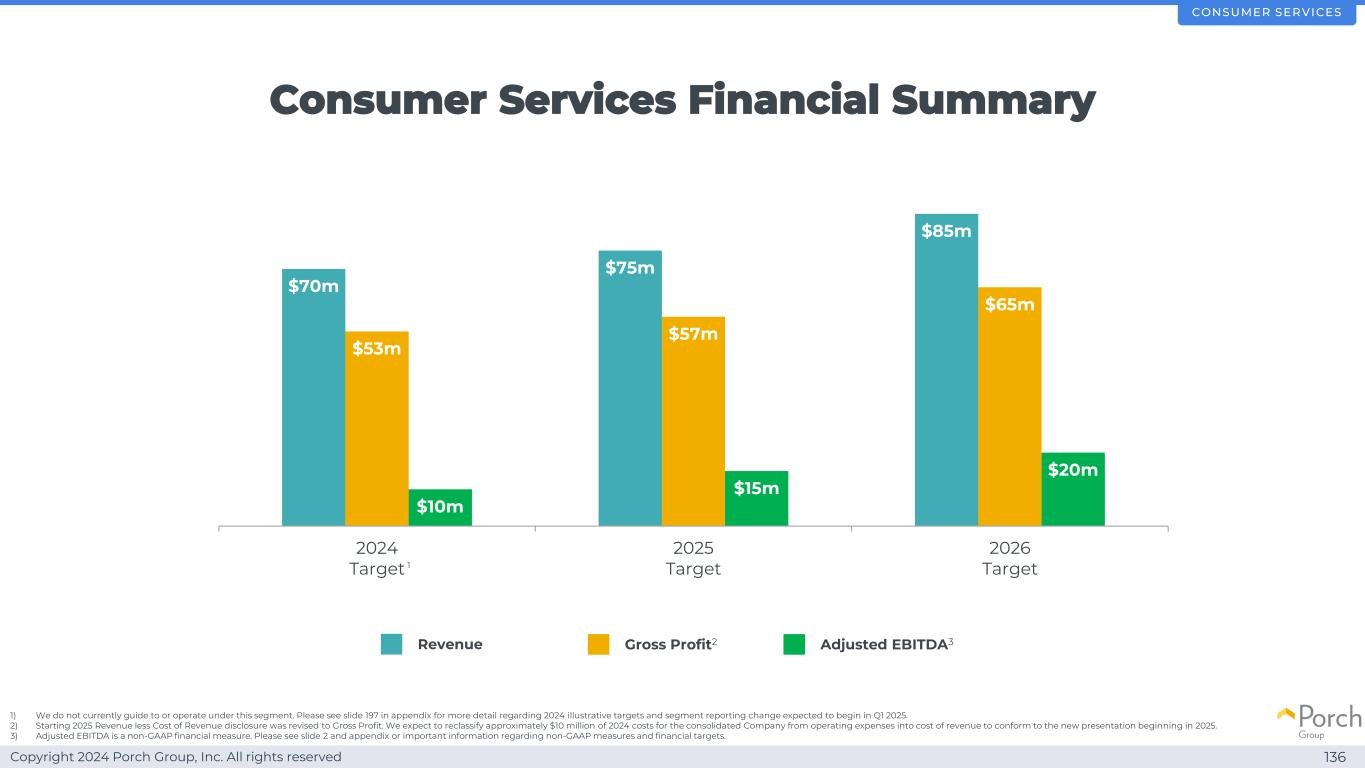 Copyright 2024 Porch Group, Inc. All rights reserved Consumer Services Financial Summary 1367000万美元7500万美元8500万美元5300万美元5700万美元6500万美元1000万美元1500万美元2000万美元2024 Target 2025 Target 2026 Target Revenue Gross Profit 2 Adjusted EBITDA3 Consumer Services1)我们目前不指导或在该分部下运营。有关预计将于2025年第一季度开始的2024年说明性目标和分部报告变化的更多详细信息,请参见附录中的幻灯片197。2)2025年起收入减收入成本披露修正为毛利。我们预计将把合并后公司2024年成本中的约1000万美元从运营费用重新分类为收入成本,以符合从2025年开始的新列报方式。3)调整后EBITDA是一种非GAAP财务指标。请看幻灯片2和附录或有关非GAAP措施和财务目标的重要信息。1