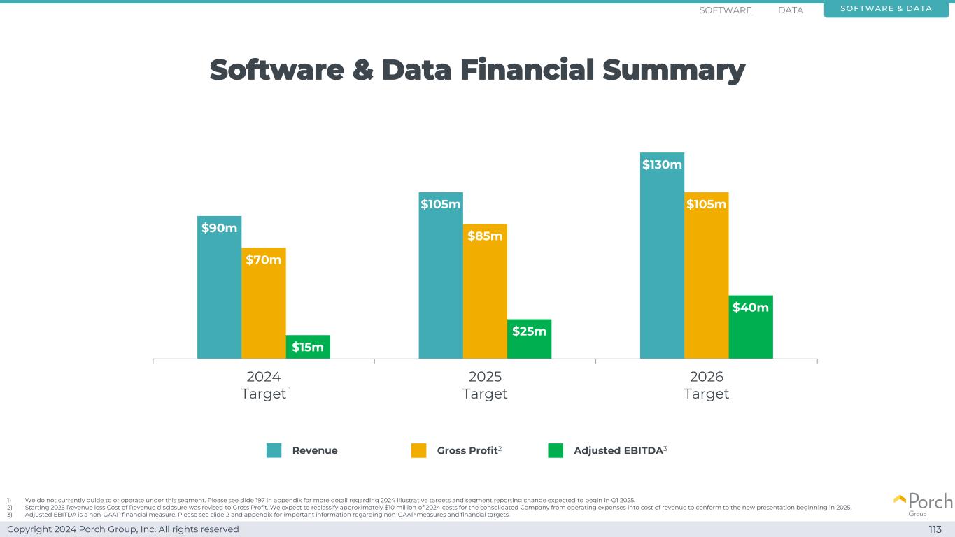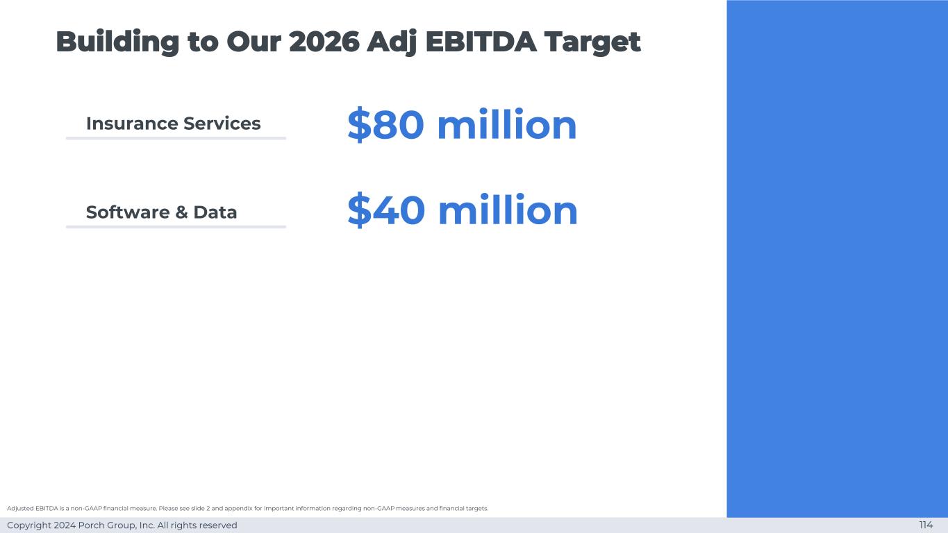 Copyright 2024 Porch Group, Inc. All rights reserved Software & Data Financial Summary 113 $ 9000万$ 1.05亿$ 1.30亿$ 7000万$ 8500万$ 1.05亿$ 1500万$ 2500万$ 4000万2024 Target 2025 Target 2026 Target Revenue Gross Profit2 Adjusted EBITDA3 Software & DATA 1)我们目前不在此分部下提供指导或运营。有关预计将于2025年第一季度开始的2024年说明性目标和分部报告变化的更多详细信息,请参见附录中的幻灯片197。2)2025年起收入减收入成本披露修正为毛利。我们预计将从2025年开始将合并后公司2024年成本中的约1000万美元从运营费用重新分类为收入成本,以符合新的列报方式。3)调整后EBITDA是一种非GAAP财务指标。有关非GAAP措施和财务目标的重要信息,请参见幻灯片2和附录。1个软件数据