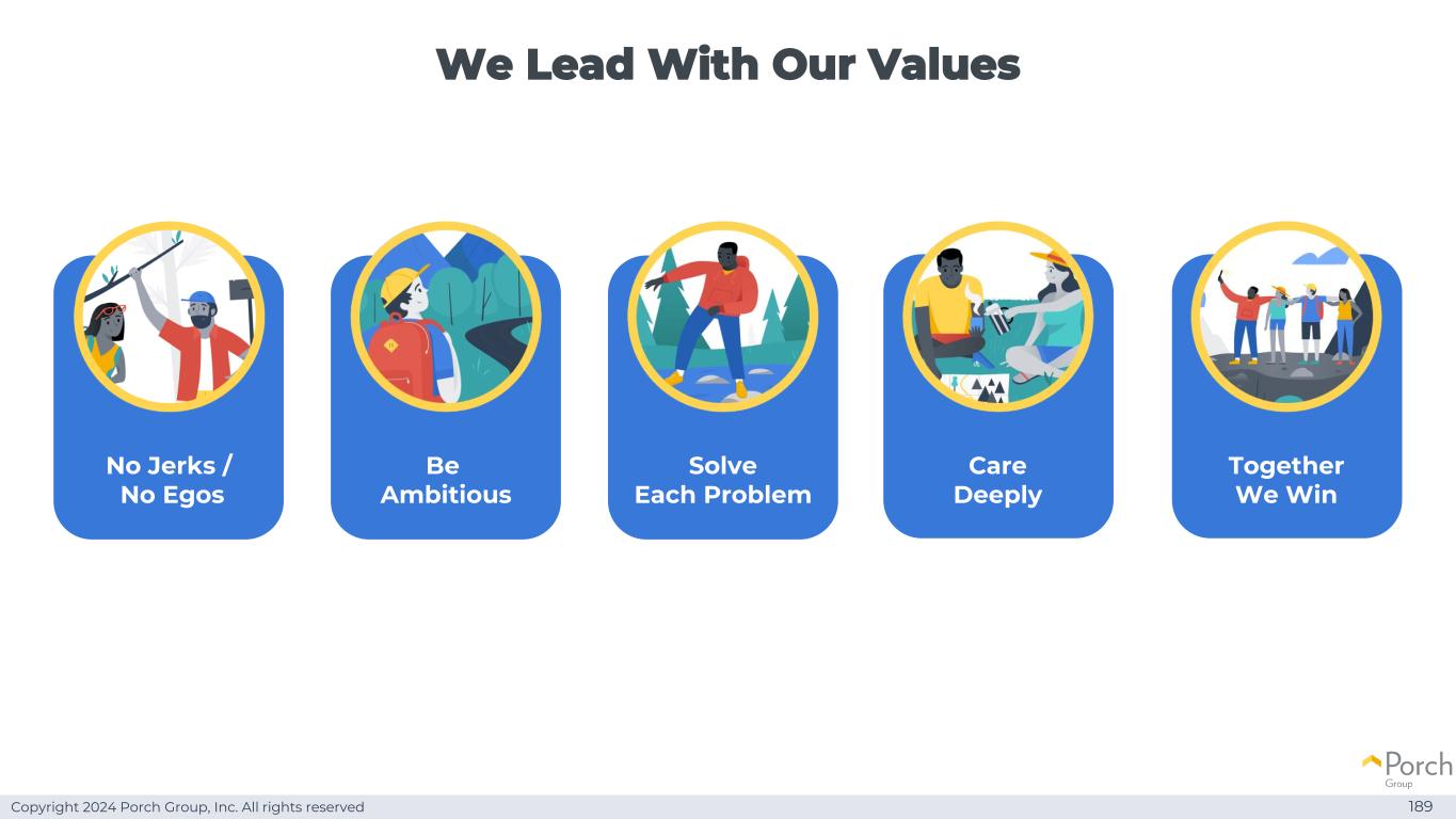 Copyright 2024 Porch Group, Inc. All rights reserved We lead with our values 189 No Jerks/no egos有雄心解决每个问题care deeply together we win
