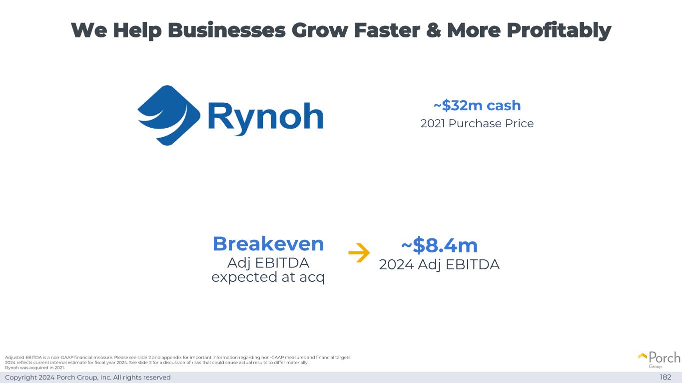 Copyright 2024 Porch Group, Inc. All rights reserved We help businesses grow faster & more profitable 1.82~3200万美元现金2021 purchase price adjusted EBITDA is a non-GAAP financial measure。有关非GAAP措施和财务目标的重要信息,请参见幻灯片2和附录。2024年反映了当前对2024财年的内部估计。有关可能导致实际结果出现重大差异的风险的讨论,请参见幻灯片2。Rynoh于2021年被收购。Breakeven Adj EBITDA expected at acq →~840万美元2024年Adj EBITDA