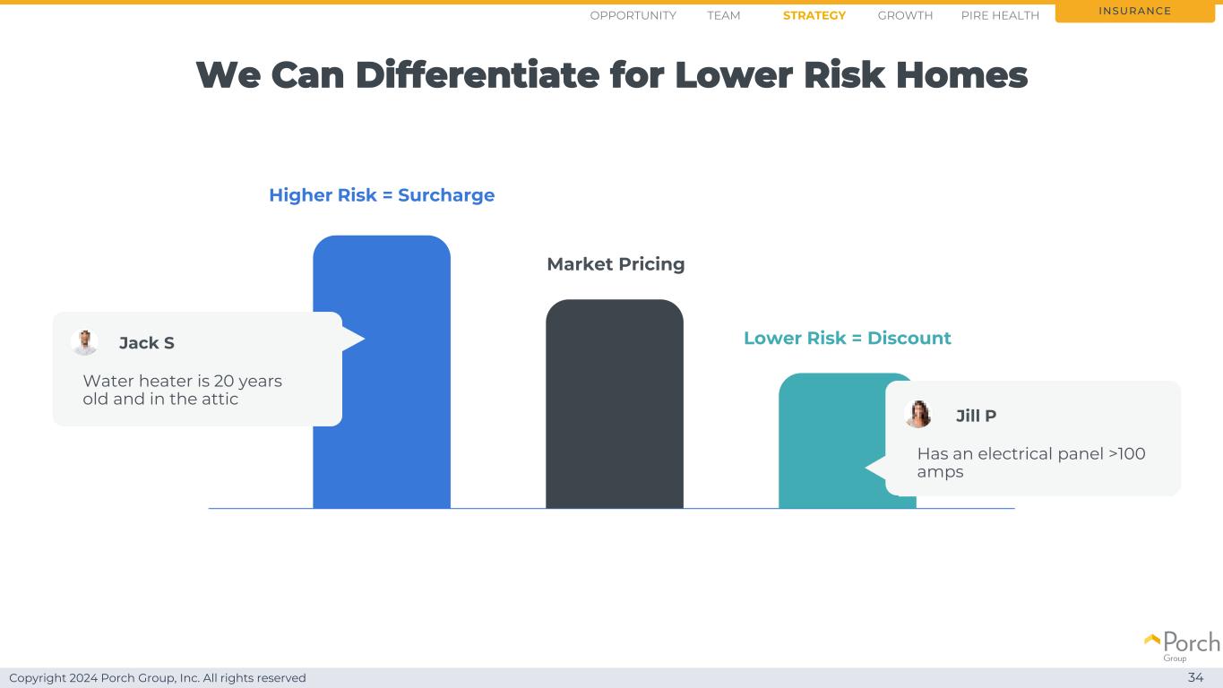 Copyright 2024 Porch Group, Inc. All rights reserved 34 insurance higher risk = surcharge lower risk = discount market pricing我们可以针对较低风险的家庭进行差异化Opportunity strategy growthteam PIRE health热水器已有20年历史,在阁楼上有一个电器面板> 100 amps Jack S Jill P