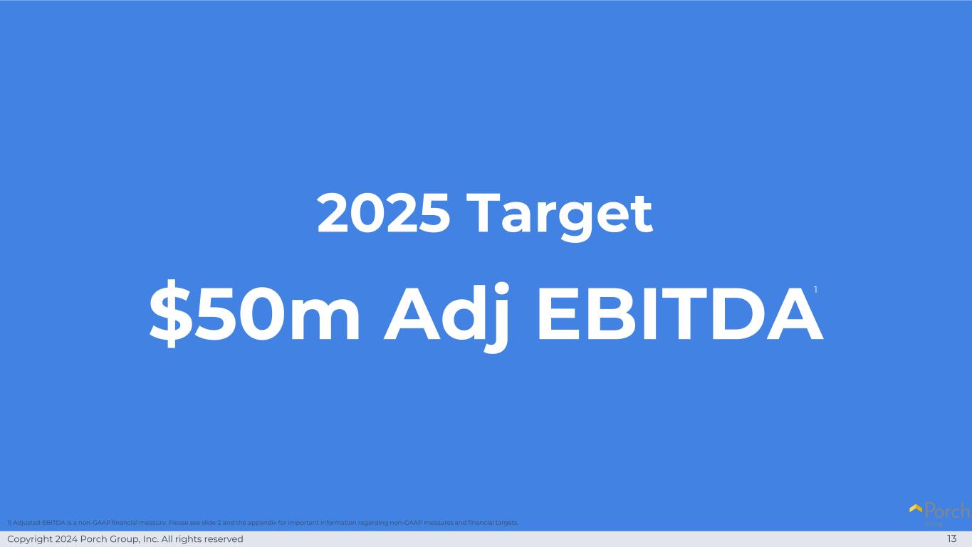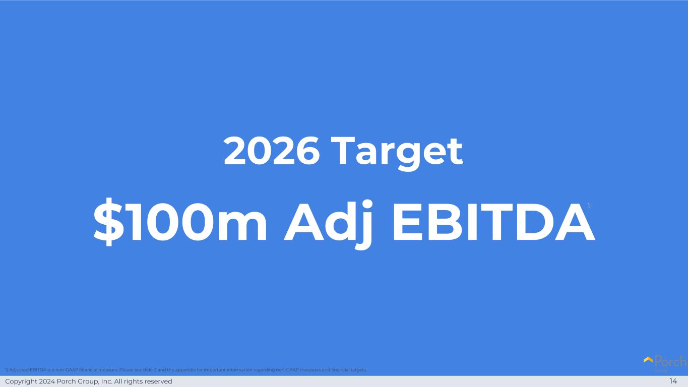Copyright 2024 Porch Group, Inc. All rights reserved 142026 Target $ 1亿Adj EBITDA 1)Adjusted EBITDA是一种非GAAP财务指标。有关非GAAP措施和财务目标的重要信息,请参见幻灯片2和附录。1