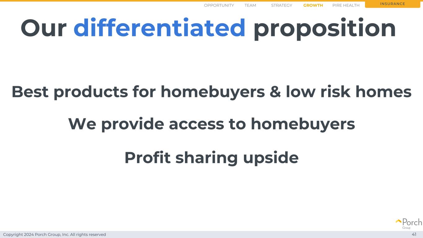 版权所有2024 Porch Group, Inc. All rights reserved 41 Profit sharing upside insurance我们的差异化主张机会战略GrowthTEAM PIRE Health我们为购房者提供获得购房者最佳产品的途径&低风险房屋