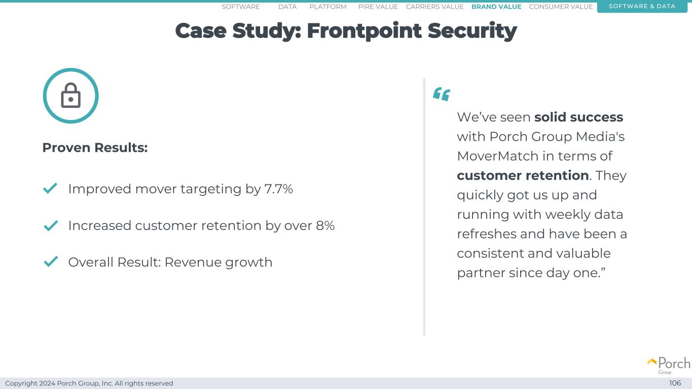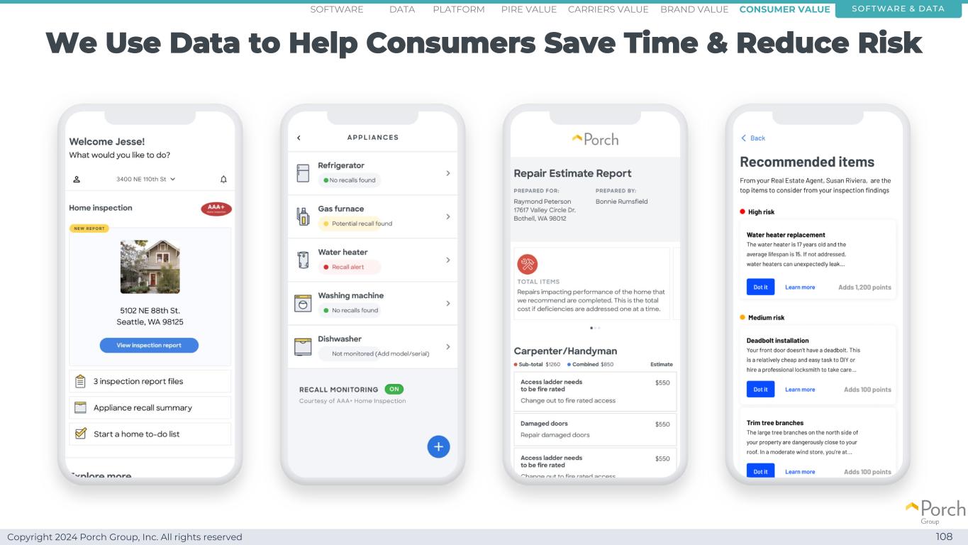 Copyright 2024 Porch Group, Inc. All rights reserved We use data to help consumers save time & reduce risk 108 software & dataconsumer valuebrand valueCarriers valuepire valuePlatformsoftware data