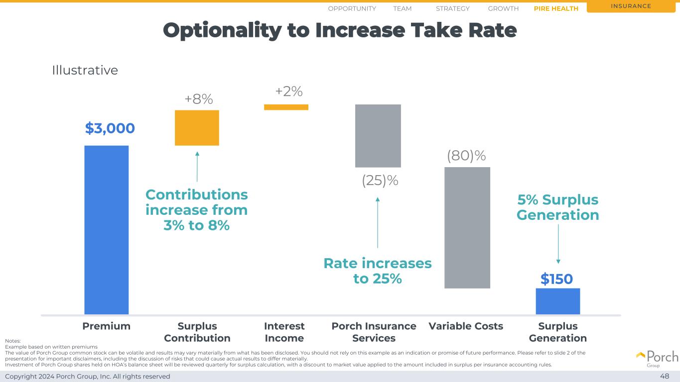 Copyright 2024 Porch Group, Inc. All rights reserved Unit economicies improve as more policyholders move to PIRE 47 notes:example based on written premium Porch Group普通股的价值可能会波动,结果可能与已披露的情况大不相同。你不应该依赖这个例子作为未来业绩的指示或承诺。请参阅演示文稿的幻灯片2,了解重要的免责声明,包括对可能导致实际结果出现重大差异的风险的讨论。在HOA的资产负债表上持有的Porch Group股票的投资将每季度进行一次盈余计算审查,并对根据保险会计规则计入盈余的金额应用市值折让。保险保费可变成本+ 8% $ 300盈余贡献(20)% $ 3,000利息收入门廊保险服务盈余产生+ 2%(80)%现在10%盈余产生贡献从3%增加到8%说明性机会战略增长团队PIRE Health