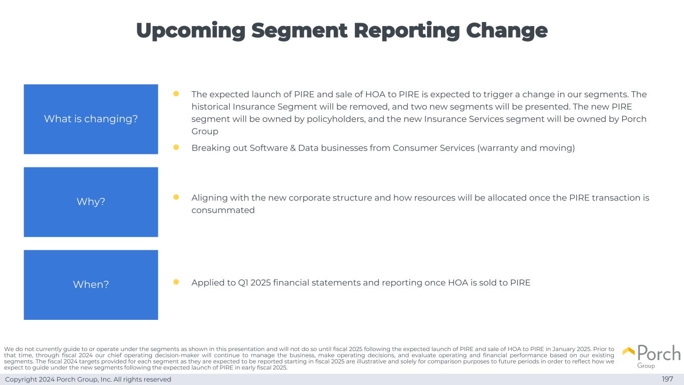 Copyright 2024 Porch Group, Inc. All rights reserved Upcoming Segment Reporting Change 197 ● PIRE的预期推出和HOA的销售给PIRE预计将触发我们部门的变化。历史上的保险板块将被移除,将呈现两个新的板块。新的PIRE板块将由投保人拥有,新的保险服务板块将由Porch Group拥有●从消费者服务(保修和搬家)中突破软件和数据业务有何变化?为什么?什么时候?●与新的公司结构保持一致以及一旦完成PIRE交易将如何分配资源●适用于2025年第一季度的财务报表并在HOA出售给PIRE后进行报告我们目前不指导或在本演示文稿中所示的分部下运营,并且在预计于2025年1月推出PIRE并将HOA出售给PIRE之后的2025财年才会这样做。在此之前,到2024财年,我们的首席运营决策者将继续管理业务,做出运营决策,并根据我们现有的分部评估运营和财务业绩。为每个细分市场提供的2024财年目标,因为它们预计将在2025财年开始报告,这些目标是说明性的,仅用于与未来期间进行比较,以反映我们预计在预计于2025财年初推出PIRE后,在新细分市场下的指导方式。