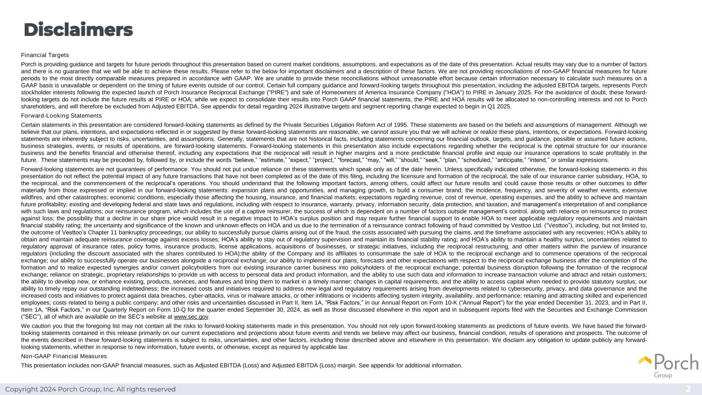 Copyright 2024 Porch Group, Inc. All rights reserved 2 Disclaimers Financial Targets Porch在整个本演示文稿中根据截至本演示文稿之日的当前市场条件、假设和预期,为未来期间提供指导和目标。实际结果可能因多种因素而有所不同,我们无法保证能够取得这些结果。有关重要的免责声明以及这些因素的描述,请参阅下文。我们不提供未来期间非GAAP财务指标与根据GAAP编制的最直接可比指标的对账。我们无法在没有不合理努力的情况下提供这些对账,因为无法获得根据GAAP计算此类措施所需的某些信息,或者取决于我们无法控制的未来事件发生的时间。在预计于2025年1月推出Porch Insurance Reciprocal Exchange(“PIRE”)和将美国保险公司(“HOA”)的房主出售给PIRE之后,本演示文稿中的某些完整的公司指导和前瞻性目标,包括调整后的EBITDA目标,代表了Porch股东的利益。为免生疑问,这些前瞻性目标不包括PIRE或HOA的未来业绩;虽然我们预计将其业绩合并到Porch GAAP财务报表中,但PIRE和HOA业绩将分配给非控股权益,而不是Porch股东,因此将被排除在调整后EBITDA之外。有关预计将于2025年第一季度开始的2024年说明性目标和分部报告变化的详细信息,请参见附录。前瞻性陈述本演示文稿中的某些陈述被视为1995年《私人证券诉讼改革法案》所定义的前瞻性陈述。这些陈述是基于管理层的信念和假设。尽管我们认为这些前瞻性陈述中反映或暗示的我们的计划、意图和期望是合理的,但我们无法向您保证我们将实现或实现这些计划、意图或期望。前瞻性陈述本质上受到风险、不确定性和假设的影响。一般来说,非历史事实的陈述,包括关于我们的财务前景、目标和指导、可能或假定的未来行动、业务战略、事件或运营结果的陈述,都是前瞻性陈述。本演示文稿中的前瞻性陈述还包括对互惠是否是我们保险业务的最佳结构以及财务和其他方面的好处的预期,包括对互惠将导致更高的利润率和更可预测的财务状况并使我们的保险业务在未来实现盈利规模的任何预期。这些陈述可能在前面、后面加上或包括“相信”、“估计”、“预期”、“项目”、“预测”、“可能”、“将”、“应该”、“寻求”、“计划”、“计划”、“预期”、“打算”等词语,或类似的表达方式。前瞻性陈述并非业绩的保证。您不应过分依赖这些声明,这些声明仅代表本文所述日期。除非另有特别说明,本演示文稿中的前瞻性陈述不反映截至本文件提交之日尚未完成的任何未来交易的潜在影响,包括互惠的许可和形成、我们的保险公司子公司HOA向互惠的出售以及互惠业务的开始。您应该了解,除其他外,以下重要因素可能会影响我们未来的业绩,并可能导致这些结果或其他结果与我们前瞻性陈述中明示或暗示的结果或结果存在重大差异:扩张计划和机会,以及管理增长,以建立消费者品牌;天气事件、广泛的野火和其他灾难的发生率、频率和严重性;经济状况,尤其是那些影响住房、保险和金融市场的经济状况;对收入、收入成本、运营费用以及实现和保持未来盈利能力的预期;现有和发展中的联邦和州法律法规,包括关于保险、保修、隐私、信息安全、数据保护和税收,以及管理层对这些法律法规的解释和遵守;我们的再保险计划,其中包括使用专属再保险人,其成功取决于管理层无法控制的许多因素, 以及依赖再保险来保护免受损失;我们的股价下跌可能会对HOA的盈余头寸造成负面影响,并可能需要进一步的财务支持,以使HOA能够满足适用的监管要求并维持财务稳定性评级;由于Vesttoo Ltd.(“Vesttoo”)实施欺诈行为后终止再保险合同而对HOA和我们产生的已知和未知影响的不确定性和重要性,包括但不限于,Vesttoo第11章破产程序的结果;我们成功追索欺诈引起的索赔的能力、追索索赔的相关成本,以及与任何追偿相关的时间框架;HOA获得并维持针对超额损失的充分再保险范围的能力;HOA置身于监管监管之外并维持其财务稳定性评级的能力;以及HOA保持健康盈余的能力;与监管机构批准保险费率、保单形式、保险产品、许可证申请、收购业务或战略举措(包括互惠重组)相关的不确定性,以及保险监管机构职权范围内的其他事项(包括与向HOA贡献的股份相关的折扣);公司及其关联公司完成向互惠交易所出售HOA并开始互惠交易所运营的能力;我们与互惠交易所一起成功运营我们的业务的能力;我们实施我们的计划的能力,对互惠交换业务的预测和其他期望在组建完成后以及实现预期的协同效应和/或将我们现有的保险承运人业务的投保人转变为互惠交换的投保人;互惠交换形成后的潜在业务中断;依靠战略、专有关系为我们提供个人数据和产品信息的访问权限,以及使用此类数据和信息来增加交易量并吸引和留住客户的能力;开发新的或增强现有产品、服务的能力,和特性,并及时将其推向市场;资本要求的变化,以及在需要时获得资本以提供法定盈余的能力;我们及时偿还未偿债务的能力;为解决与网络安全、隐私和数据治理相关的发展所产生的新的法律和监管要求所需的成本增加和举措,以及为防范数据泄露、网络攻击、病毒或恶意软件攻击或影响系统完整性、可用性的其他渗透或事件而增加的成本和举措,和业绩;留住和吸引有技能和有经验的员工;与成为一家上市公司相关的成本;以及我们截至2023年12月31日止年度的10-K表格年度报告(“