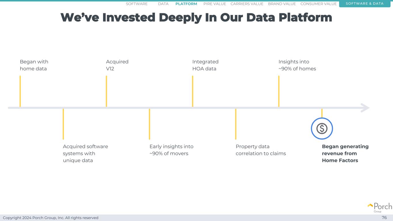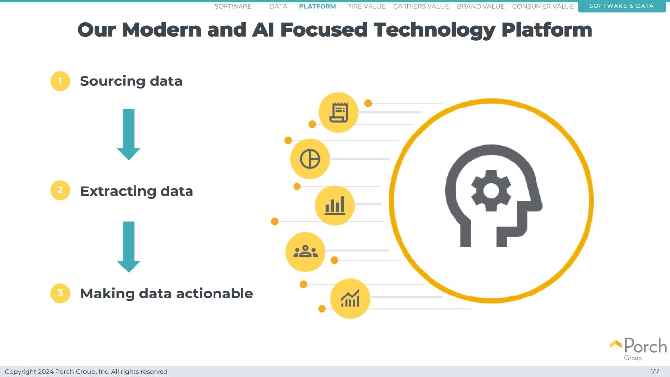 Copyright 2024 Porch Group, Inc. All rights reserved Our modern and AI focused technology platform sourcing data extracting data making data actionable software & datasoFTWARE consumer valueCarriers valuepire value brand valuePlatform 123 data 77