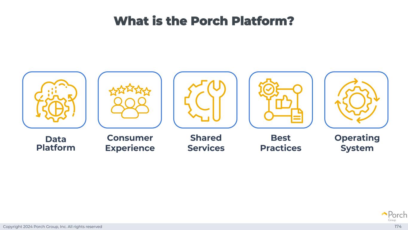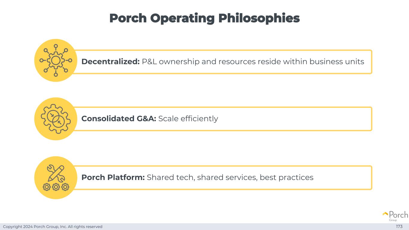 Copyright 2024 Porch Group, Inc. All rights reserved Porch Operating Philosophies 173 Consolidated G & A:Scale Efficiently Porch Platform:Shared technology,shared services,best practices Decentralized:P & L ownership and resources reside within business units