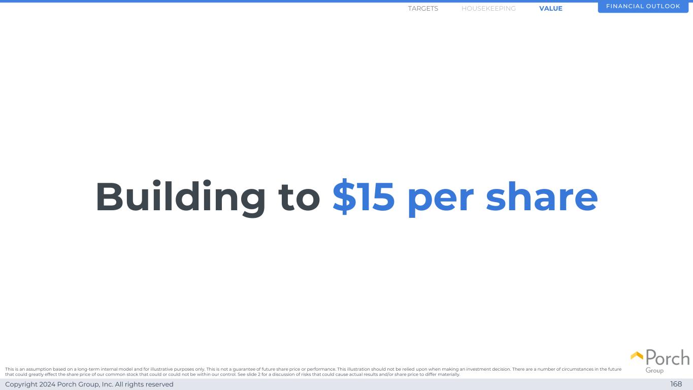 Copyright 2024 Porch Group, Inc. All rights reserved 168 Building to $ 15 per share FINANCIAL OUTLOOKHOUSEKEEPINGTARGETS这是一个基于长期内部模型的假设,仅用于说明目的。这并不是对未来股价或业绩的保证。在做出投资决定时,不应依赖这一例证。未来有许多情况可能会极大地影响我们普通股的股价,这些情况可能在我们的控制范围内,也可能不在我们的控制范围内。有关可能导致实际结果和/或股价出现重大差异的风险的讨论,请参见幻灯片2。价值