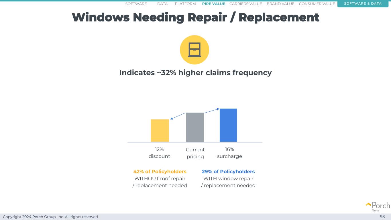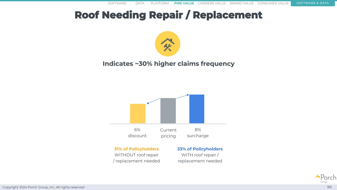 Copyright 2024 Porch Group, Inc. All rights reserved Roof needs repair/replacement 90 indicates~30% higher claims frequency 33% of policyholders with roof repair/replacement needs 31% of policyholders without roof repair/replacement needs current pricing 8% surchase 6% discount software & dataconsumer valueCarriers valuepire value brand valueplatformsoftware data