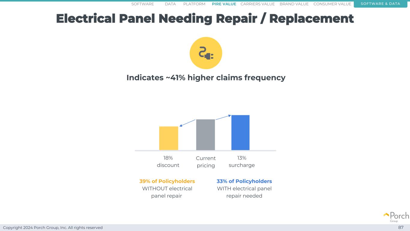 Copyright 2024 Porch Group, Inc. All rights reserved Electric Panel needs repair/replacement 87 indicates~41% higher claims frequency 33% policyholders with electric Panel repair needs 39% policyholders without electric Panel repair current pricing 13% surchase 18% discount software & dataconsumer valueCarriers valuepire value brand valueplatformsoftware data