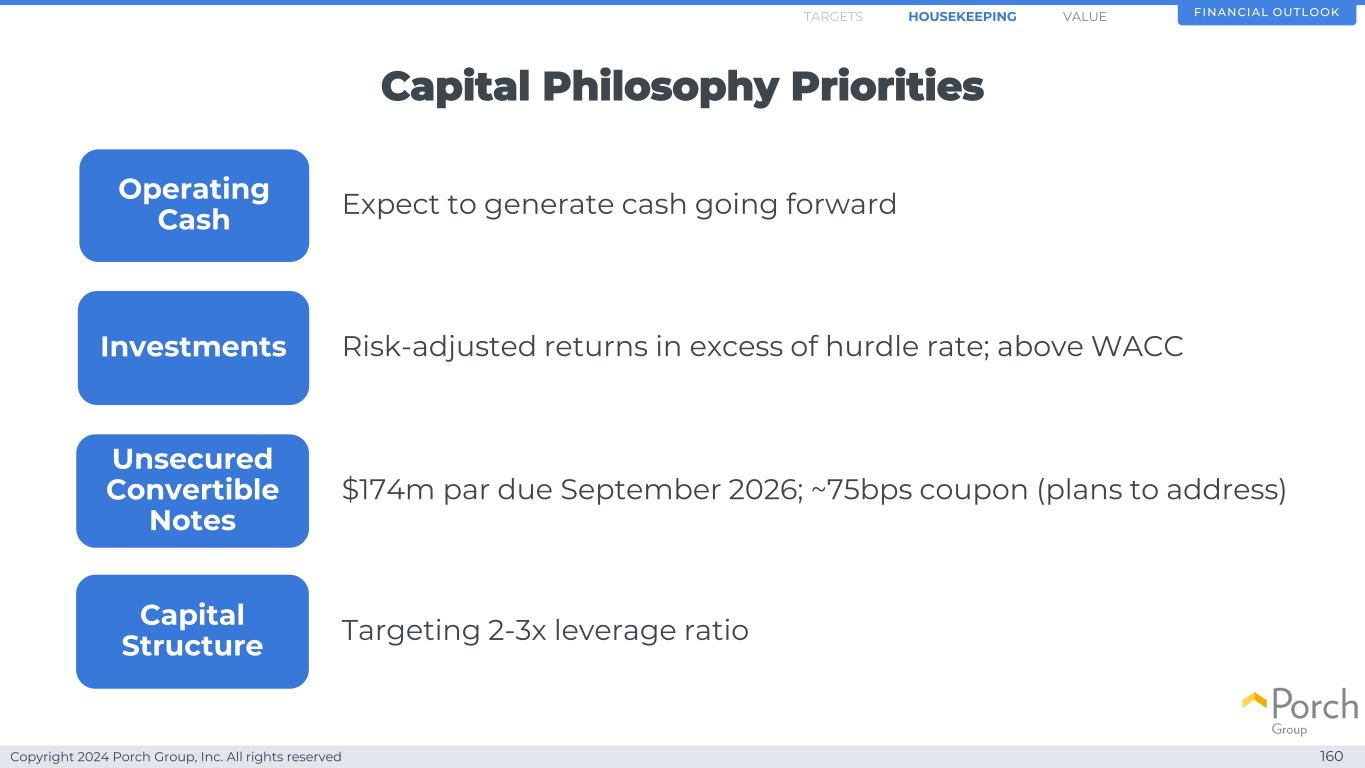 Copyright 2024 Porch Group, Inc. All rights reserved capital philosophy priorities 160 Operating cash investments capital structure Structure unsecured convertible notes financial outlookHOUSEKEEPINGTARGETS expects to generate cash forward risk-adjusted returns more than hurkle rate;above WACC $ 1.74m par到期2026年9月;~75bps coupon(plan to address)targeting 2-3 x leverage ratio value