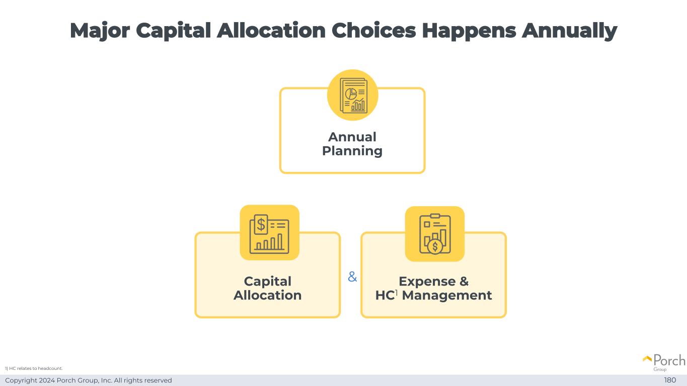 Copyright 2024 Porch Group, Inc. All rights reserved Major capital allocation choices happens annual 180 expense & HC1 management capital allocation & annual planning 1)HC related to headcount。