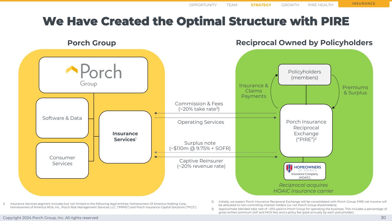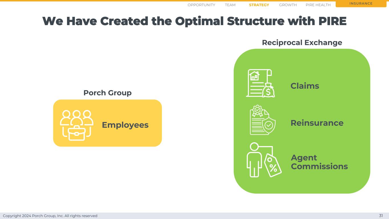 Copyright 2024 Porch Group, Inc. All rights reserved We have created the optimal Structure with PIRE 31 insurance recival exchange Porch Group employees claims agent commissions reinsurance opportunity strategy growth team PIRE health