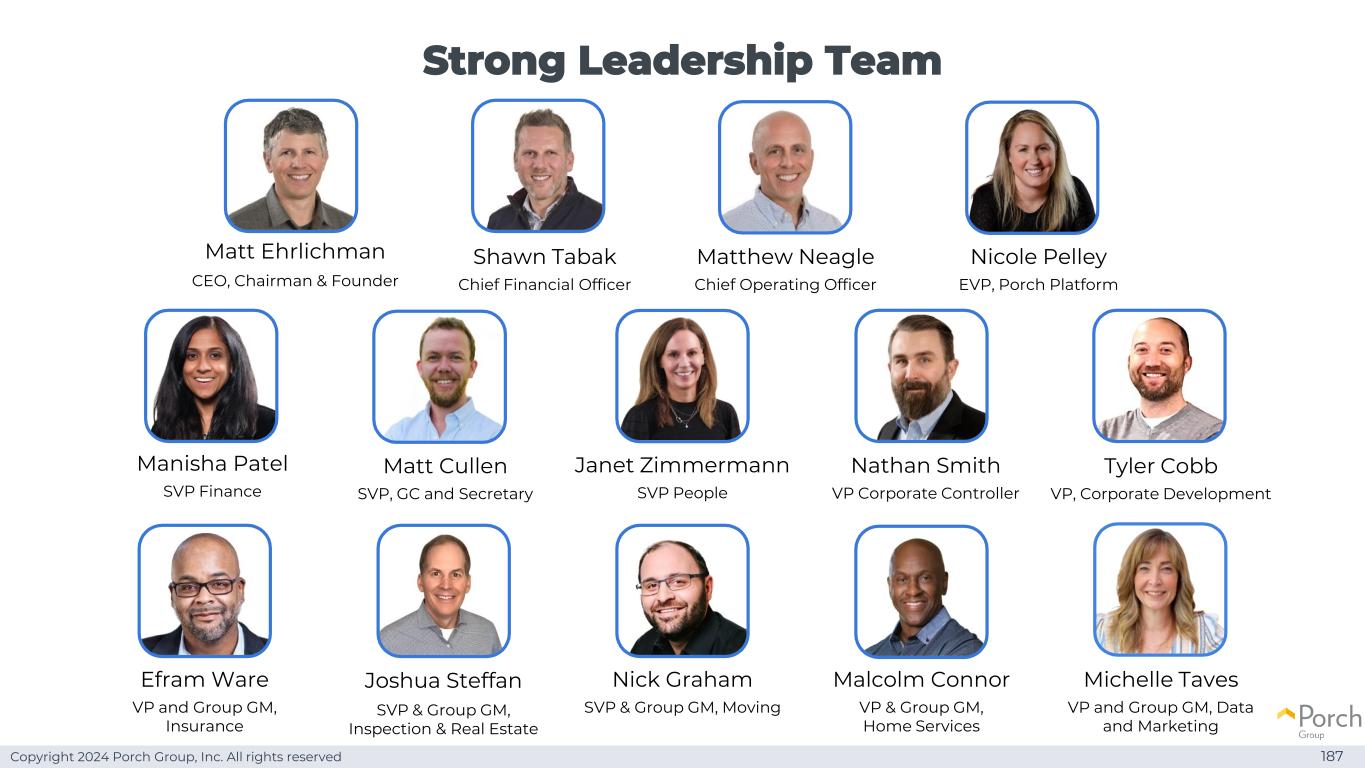 Copyright 2024丨波奇集团股份有限公司Porch Group, Inc. All rights reserved Strong Leadership Team Nicole Pelley EVP,Porch Platform Efram Ware VP and Group GM,Insurance Malcolm Connor VP & Group GM,Home Services Joshua Steffan高级副总裁& Group GM,Inspection & Real Estate Manisha Patel财务高级副总裁Nick Graham高级副总裁& Group GM,Moving丨Matt Ehrlichman丨首席执行官、董事长兼创始人Shawn Tabak 首席财务官TERM2 Matthew Neagle首席运营官Matt Cullen高级副总裁、GC和秘书Janet Zimmermann高级副总裁People Michelle Taves副总裁兼集团总经理、数据和市场营销部Nathan Smith丨副总裁公司控制人Tyler Cobb企业发展副总裁187