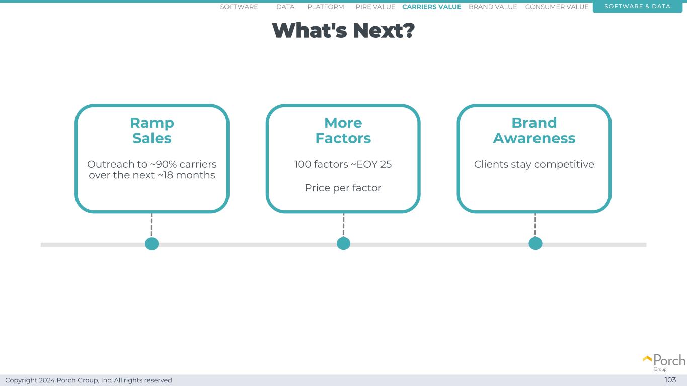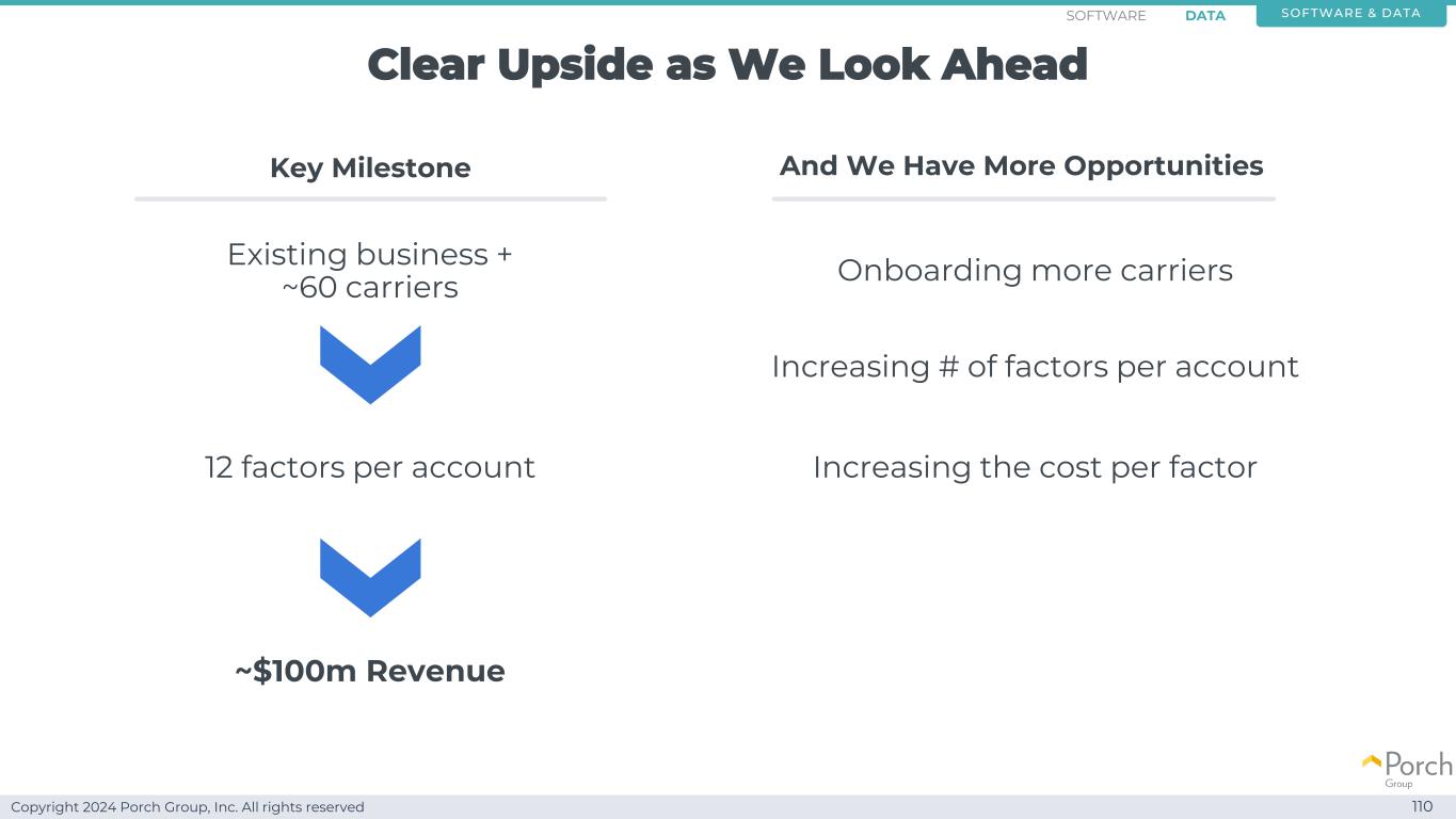 Copyright 2024 Porch Group, Inc. All rights reserved clear upside as we look ahead 110 software & datasoFTWARE data Key milestone and we have more opportunities existing business +~60 carriers 12 factors per account~$ 100m revenue onboarding more carriers increasing # factors per account increasing the cost per factor