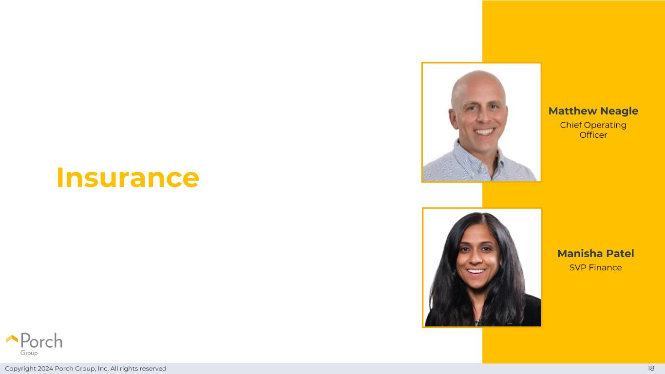 Copyright 2024 Porch Group, Inc. All rights reserved Introductions 17 Nicole Pelley执行副总裁Matthew Neagle首席运营官Manisha Patel财务高级副总裁Shawn Tabak消费者服务首席财务官保险财务软件和数据