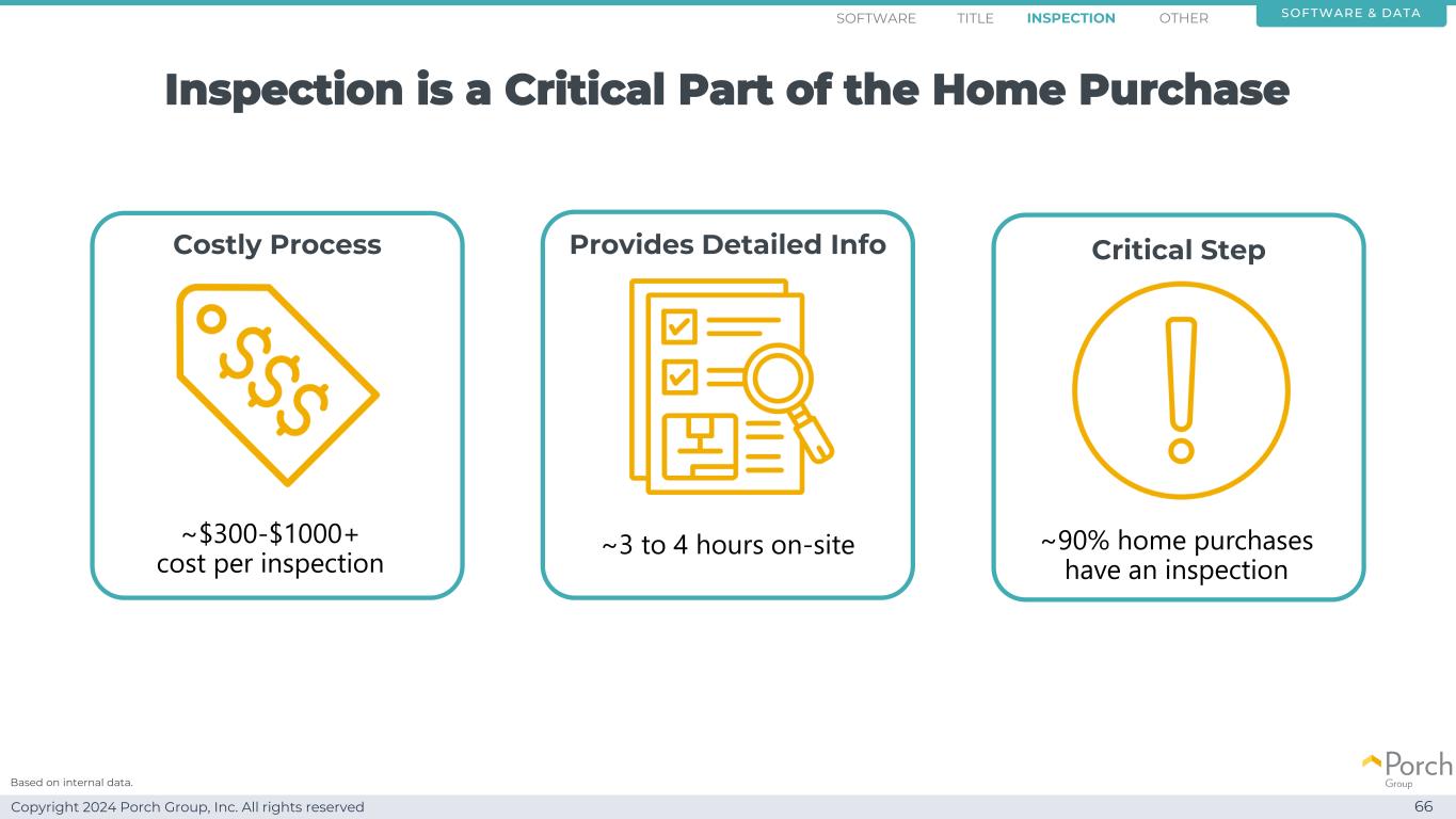 Copyright 2024 Porch Group, Inc. All rights reserved inspection is a critical part of the home buying 66 critical step~90% home buyers have an inspection provides detailed information~3到4小时的现场费用流程~$ 300-$ 1000 +成本每次检查软件& datainspection othertitleSoftware based on internal data。