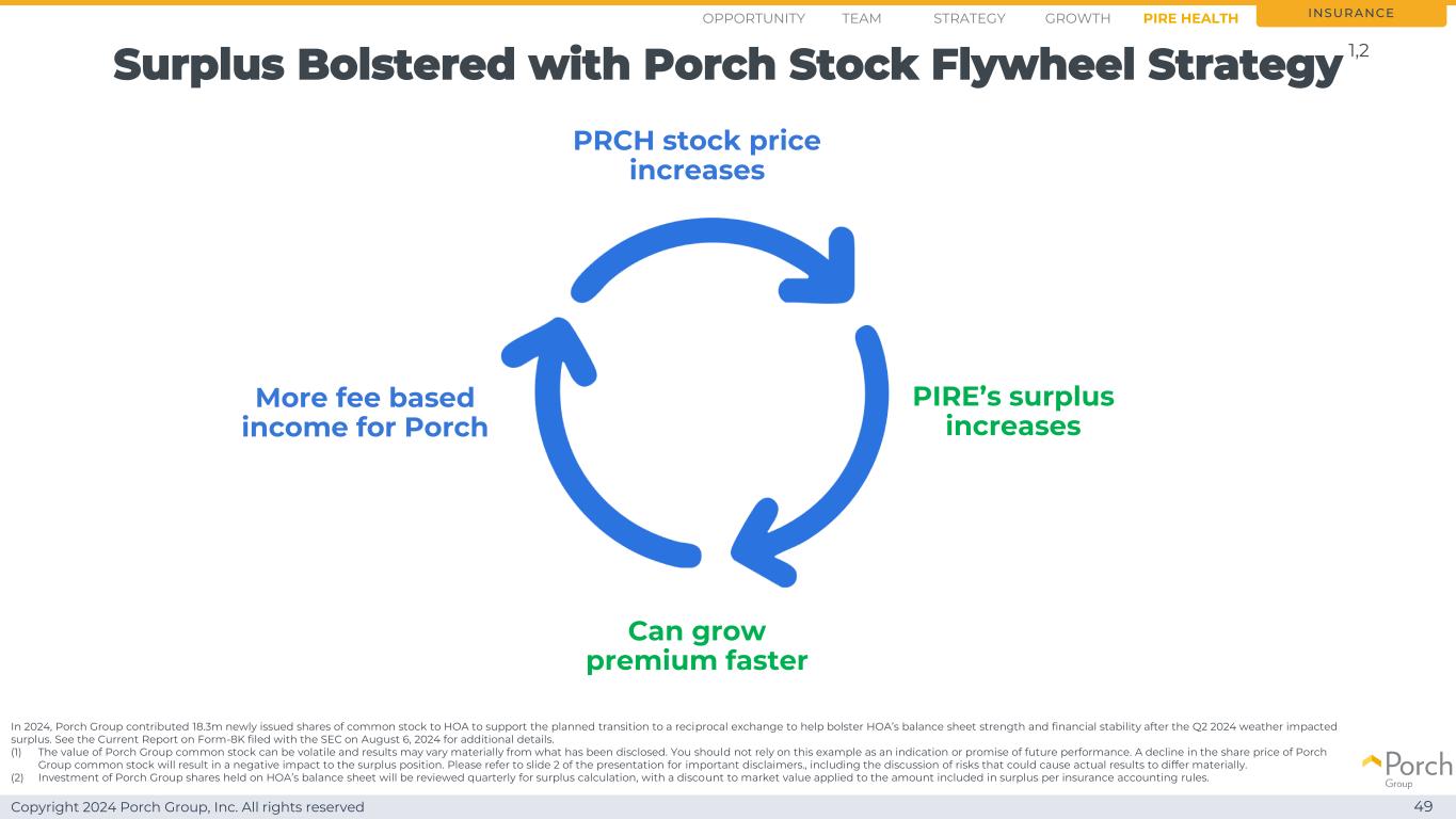 Copyright 2024 Porch Group, Inc. All rights reserved surplus bolsted with porch stock flywheel strategy 49 PRCH股价上涨PIRE盈余增加可使溢价增长更快More fees based income for porch in 2024,Porch Group向HOA贡献了1830万股新发行的普通股,以支持计划中的向互惠交换的过渡,以帮助在2024年第二季度天气影响盈余后增强HOA的资产负债表实力和财务稳定性。有关更多详细信息,请参阅2024年8月6日向SEC提交的有关Form-8K的当前报告。(1)Porch Group普通股的价值可能会波动,结果可能与已披露的结果存在重大差异。你不应该依赖这个例子作为未来业绩的指示或承诺。Porch Group普通股股票价格下跌将对盈余头寸产生负面影响。请参阅演示文稿的幻灯片2,了解重要的免责声明。,包括对可能导致实际结果出现重大差异的风险的讨论。(2)将每季度对HOA资产负债表上持有的Porch Group股份的投资进行审查,以进行盈余计算,并根据保险会计规则对计入盈余的金额应用市值折让。保险机会战略成长团队PIRE Health 1,2