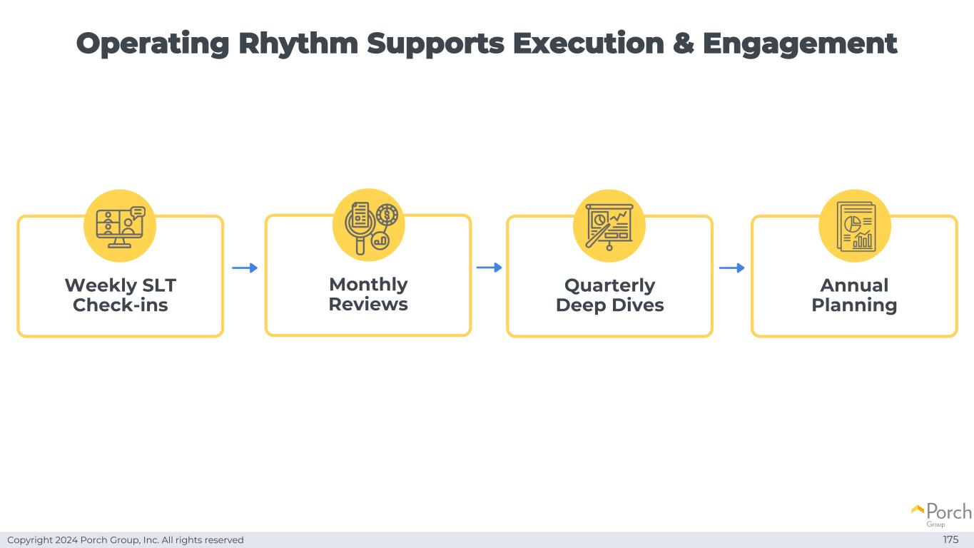 Copyright 2024 Porch Group, Inc. All rights reserved Operating Rhythm Supports Execution & Engagement 175 Weekly SLT Check-in Annual Planning Quarterly Deep Dives Monthly Reviews